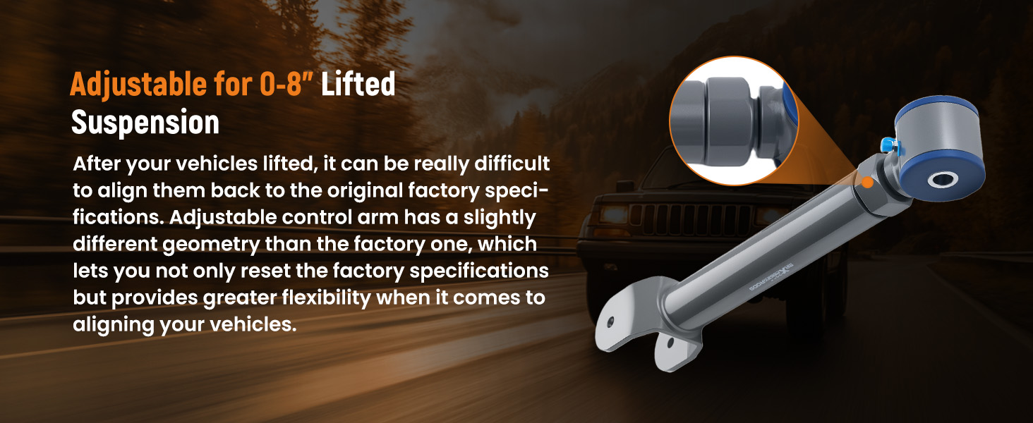 - Adjustable control arms are the perfect replacement for standard factory version and really show their use when the vehicle leaves pavement to head off road