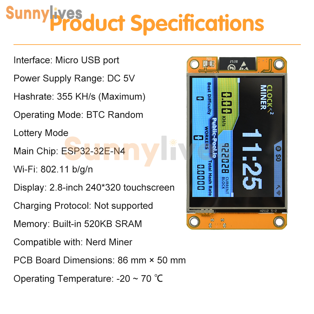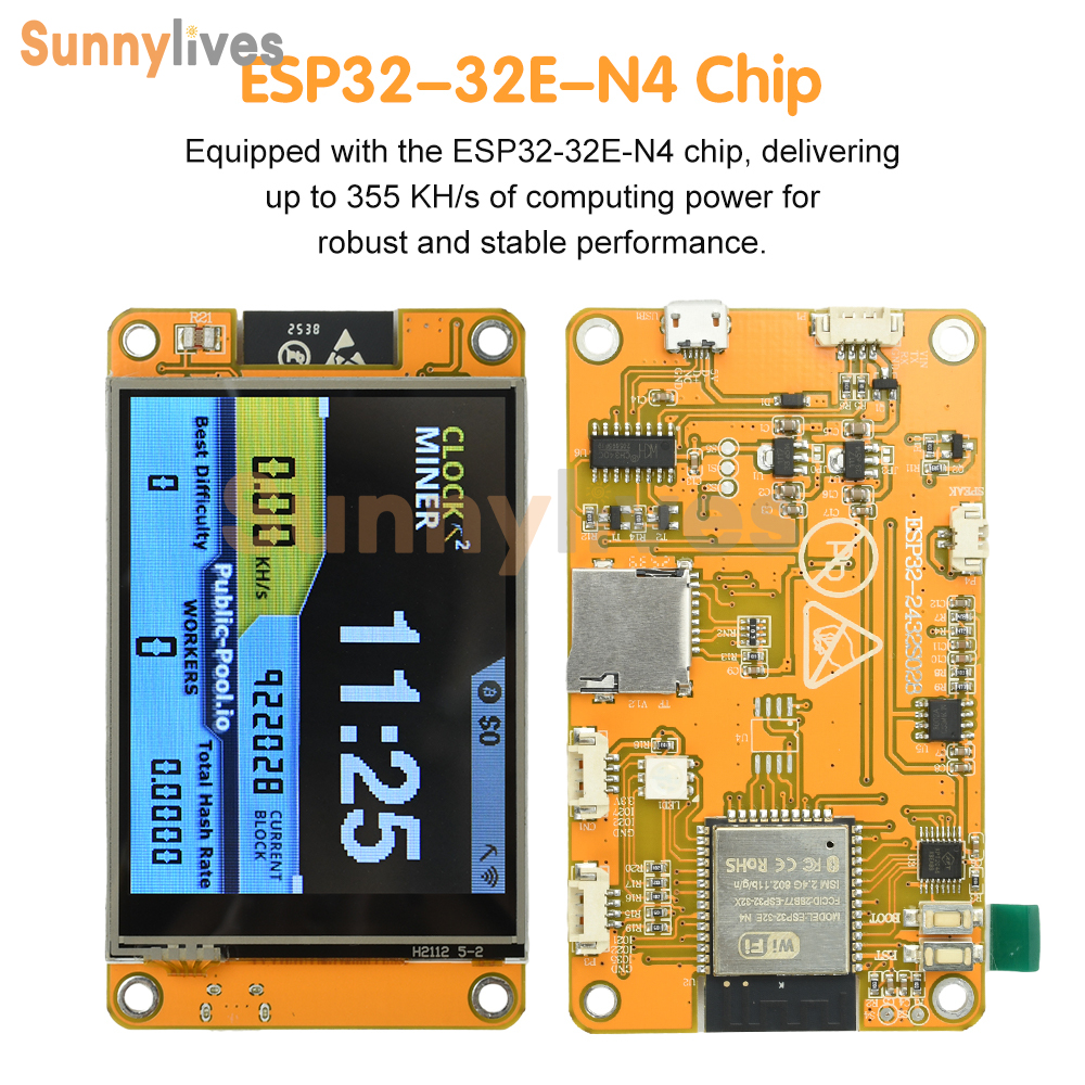 1. Equipped with ESP32-32E-N4 chip, the computing power can reach up to 355KH/s, with strong and stable performance.