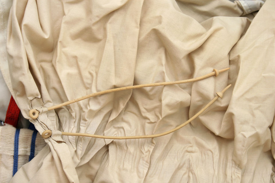 The spacesuit is in perfect technical and esthetic condition, worn couple of times for launch and descent only, without any serious defects. The adjustment mechanisms operate perfectly. External and internal layers, gloves, hoses and connectors, pressure regulator, manometer - all structural elements, including the mechanism for closing the helmet, are in good working order. There were no air leaks detected when the spacesuit was pressurized. Its exterior is clean, the nylon fabric is not faded, the elbows are not much yellowish. The gloves of GP-7S model can be easely attached and removed to the sleeves, their numbers are clear and well readable, as well as the numbers on the sleeves' attachment rings, distorted on the photos for this description only. The following patches are available on the suit: the logo of NPP "Zvezda", the logo of ROSKOSMOS, the Russian flag. The name tag and the mission patches are absent. No restoration is required.