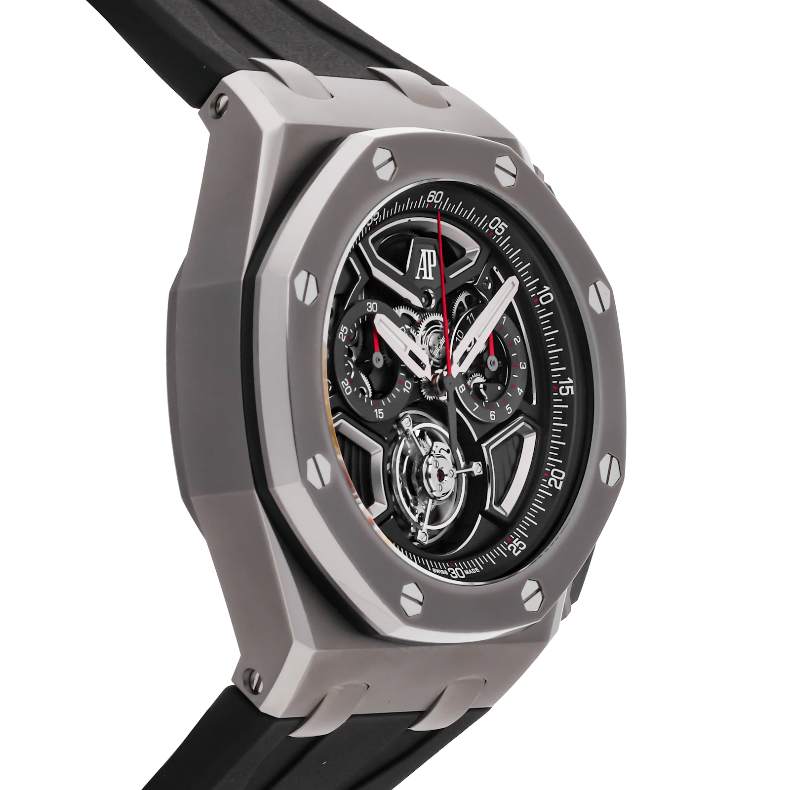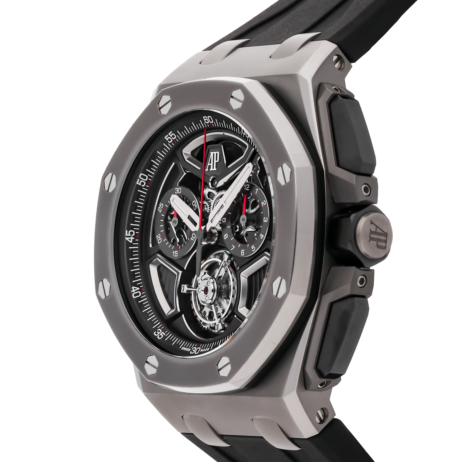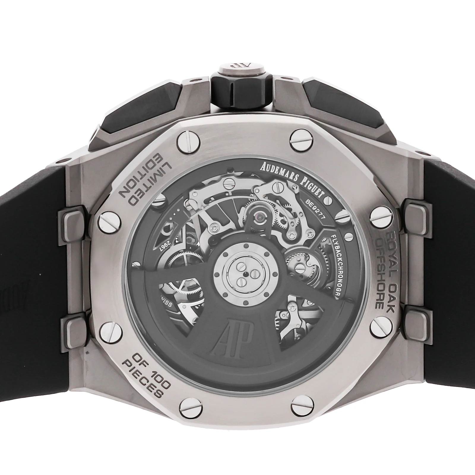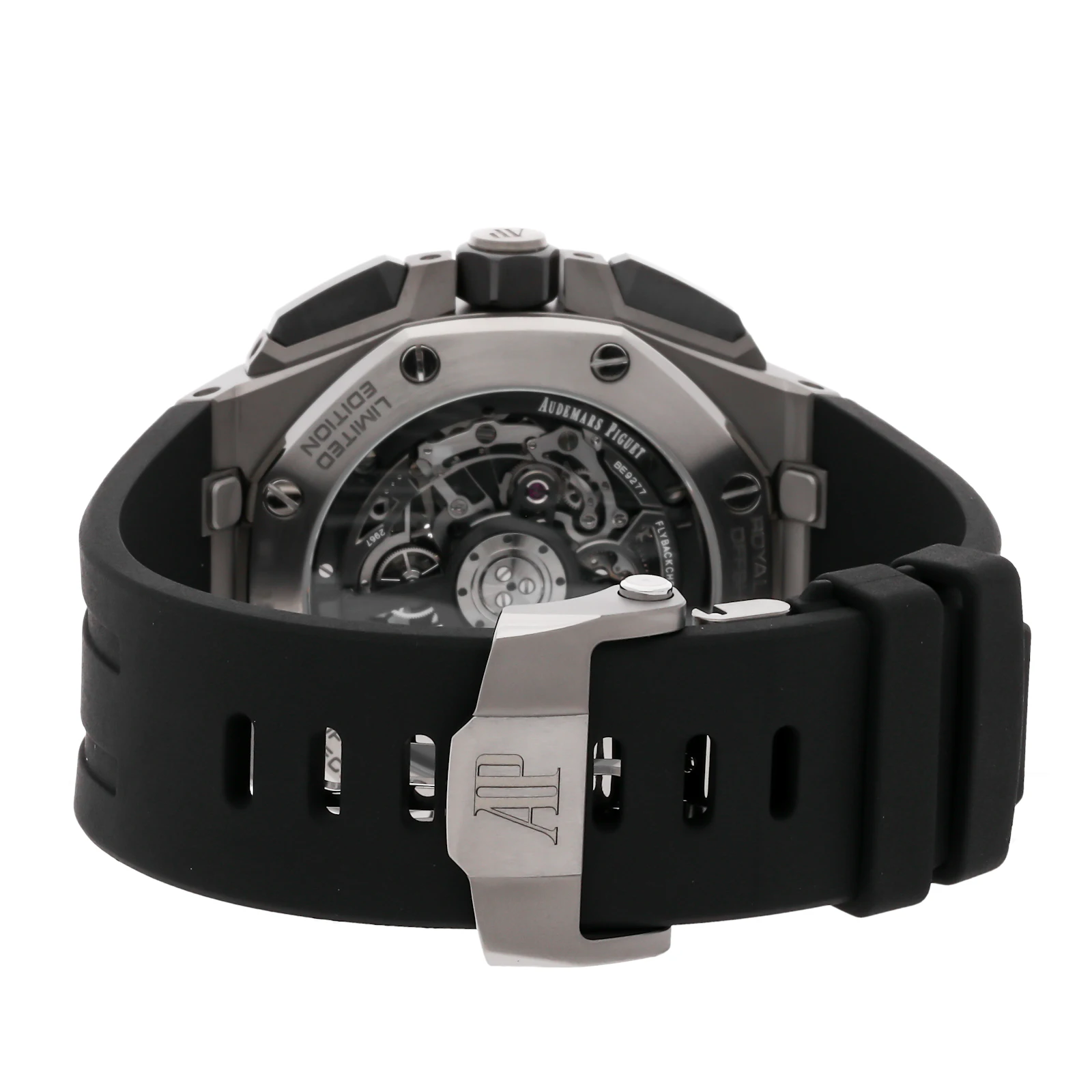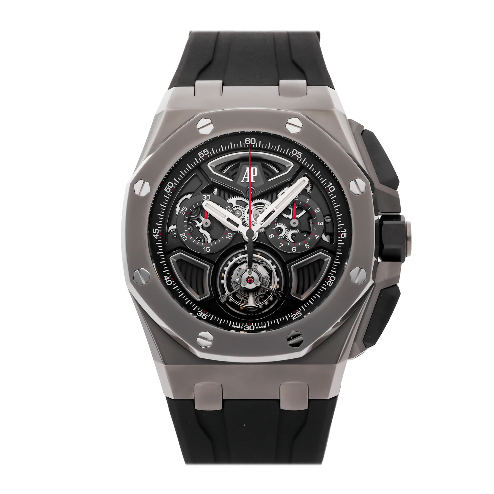 Pre-Owned Audemars Piguet Royal Oak Offshore Flying Tourbillon Chronograph Limited Edition (26622TIGGD002CA01) self - winding automatic watch, features a 43mm titanium case surrounding a black dial on a black rubber strap with a titanium deployant buckle. Functions include hours, minutes, small seconds, flyback chronograph and tourbillon. This is a Limited Edition piece of 100! This watch comes complete with original box and papers. We back this watch with a 2-Year warranty by The 1916 Company!