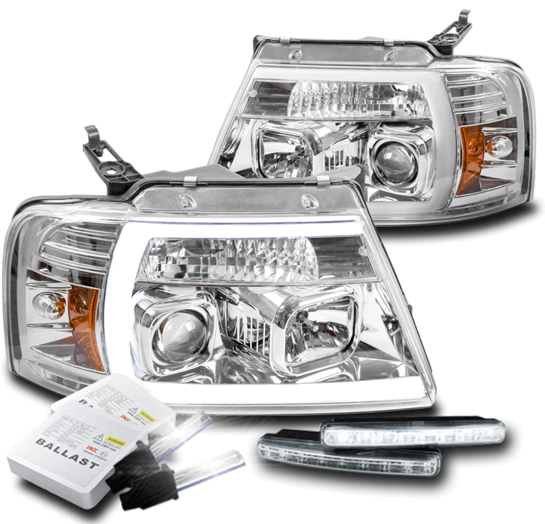 A pair of headlights (driver and passenger side), a pair of DRL lights, and a set of HID conversion kit 35W 6000K