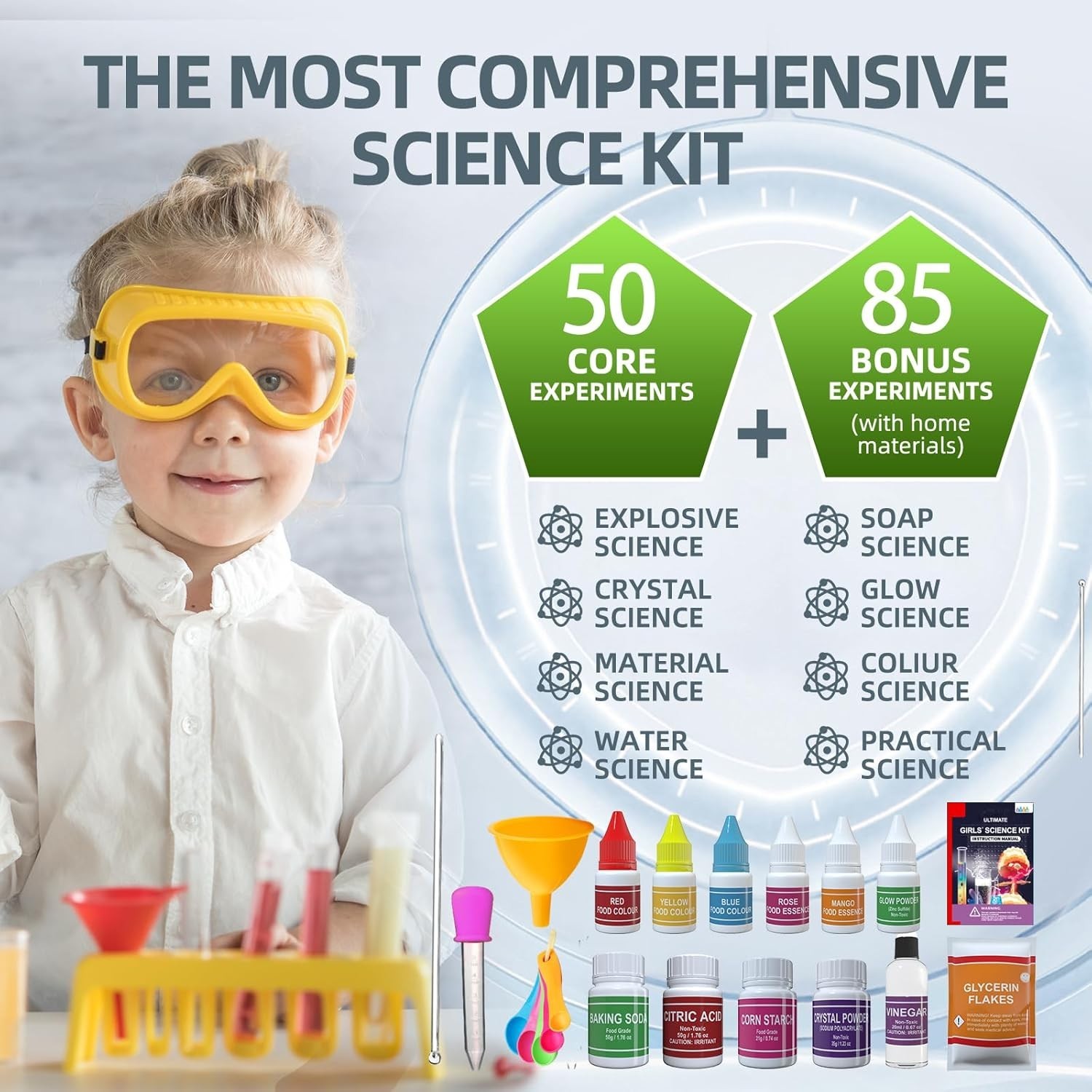 【All-in-One Science Lab Kit】 Comes with beakers, droppers, food colourings, powders, test tubes, pipettes, and instruction guide for an authentic lab experience at home.
