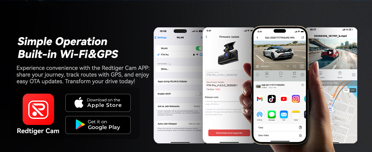[Built-in GPS&WIFI] Android and iOS users can connect to REDTIGER APP via WIFI to realize wireless operation and control of dash cam. User-recorded driving videos can be shared with friends or insurance companies, through one click to share the driving experience in real-time. With OTA function, wireless upgrades are easily accomplished. Additionally, Built-in GPS provides prcise traceable location, speed and route in the recording.
