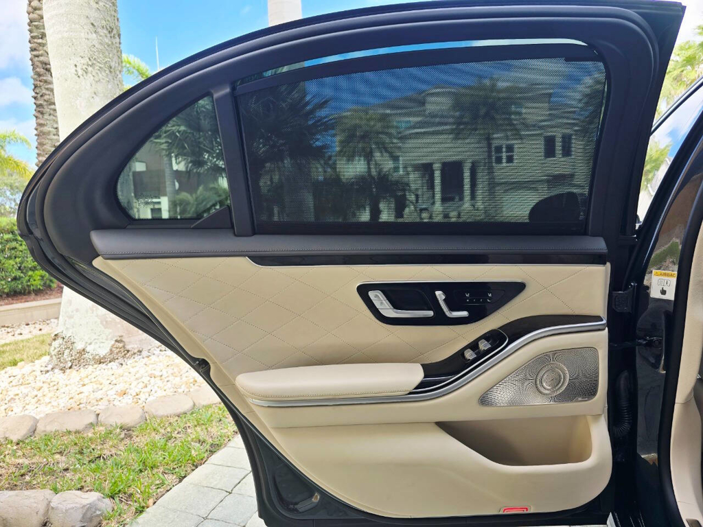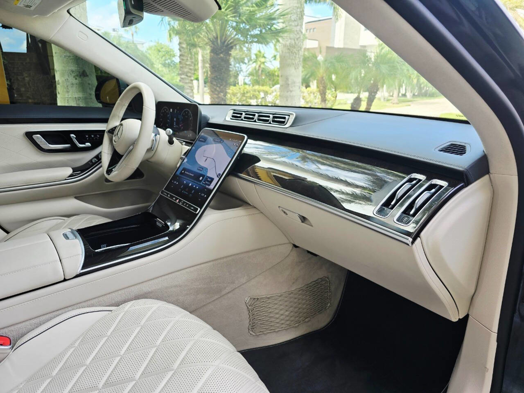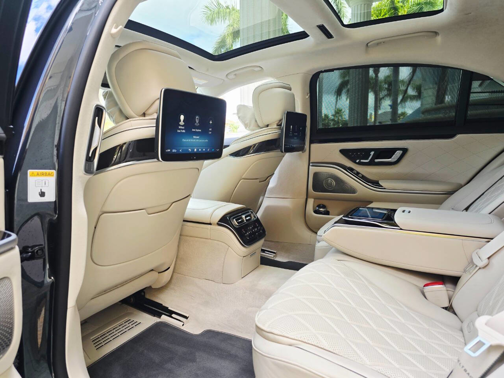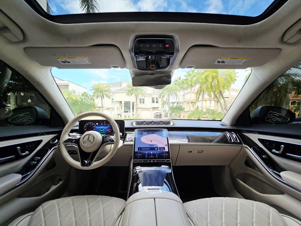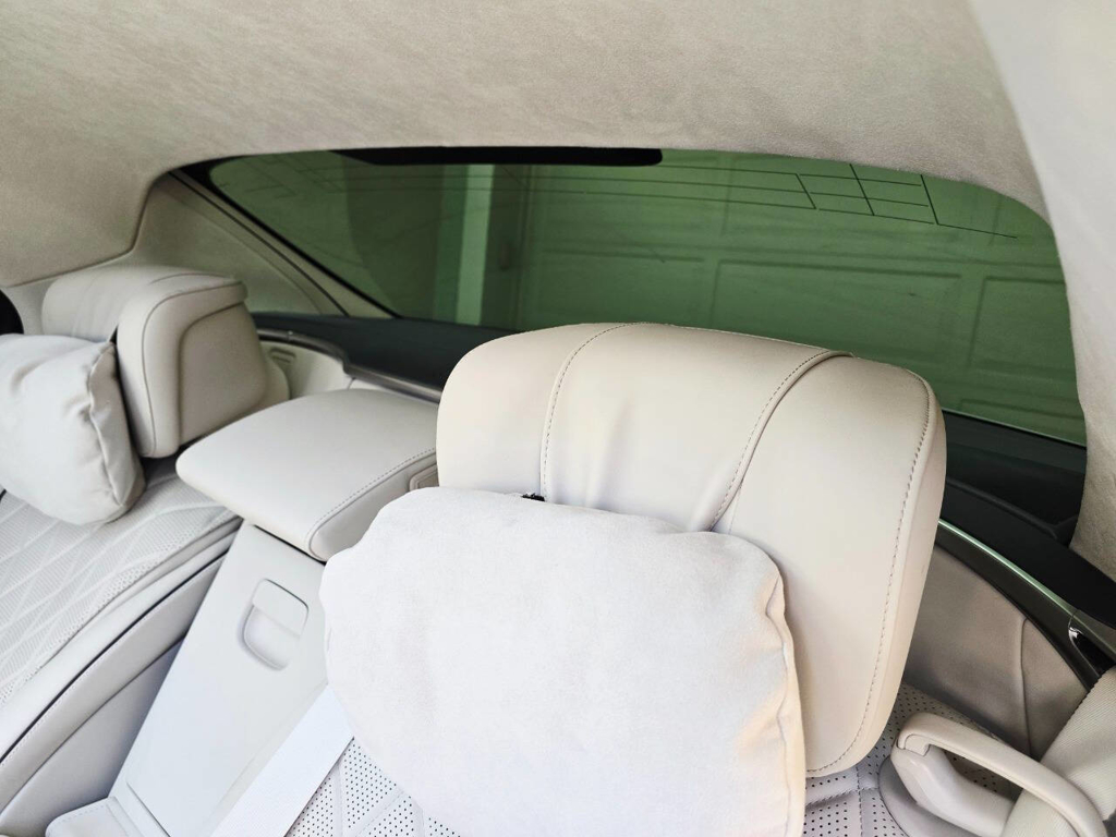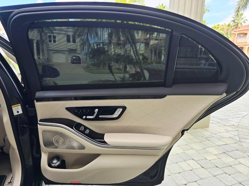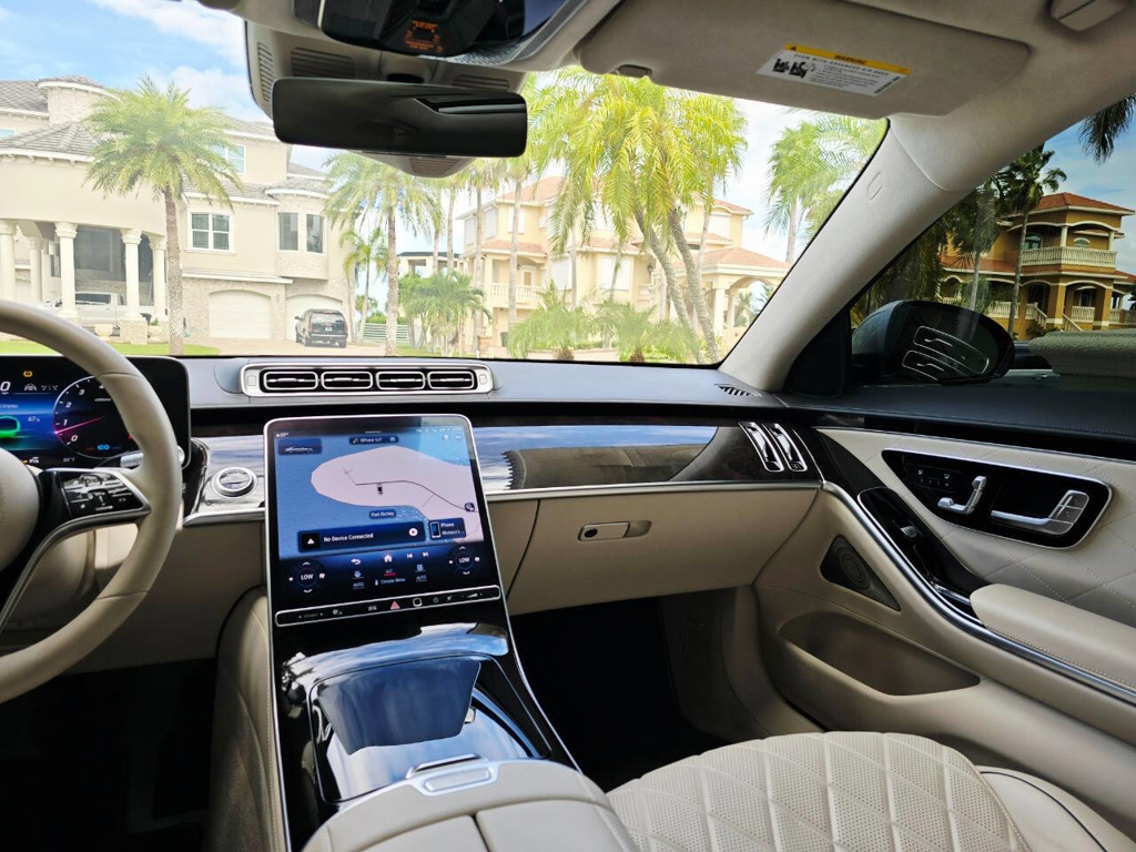 Step inside, and the cabin presents an equally captivating narrative. This particular S580 is optioned with the stunning Macchiato Beige and Magma Grey Exclusive Nappa Leather upholstery, a $3,110 factory option that elevates the interior to the upper echelon of Mercedes-Benz design. Accented with Slate High Gloss Wood Trim, every surface feels handcrafted and thoughtfully curated. Rear passengers are treated to dual rear entertainment displays, part of the $3,400 Rear Seat Entertainment Package, which includes the MBUX High-End Rear Seat Entertainment System and the Rear ENERGIZING package to stimulate comfort and relaxation during long journeys.