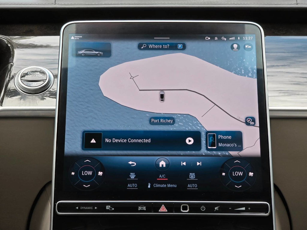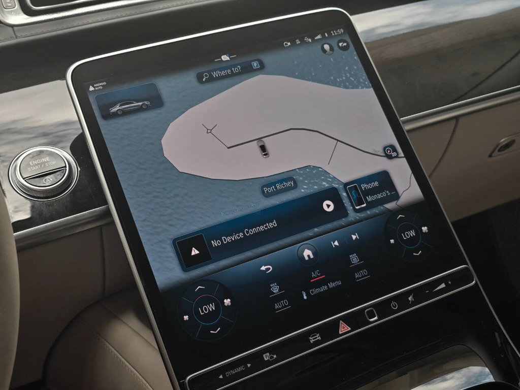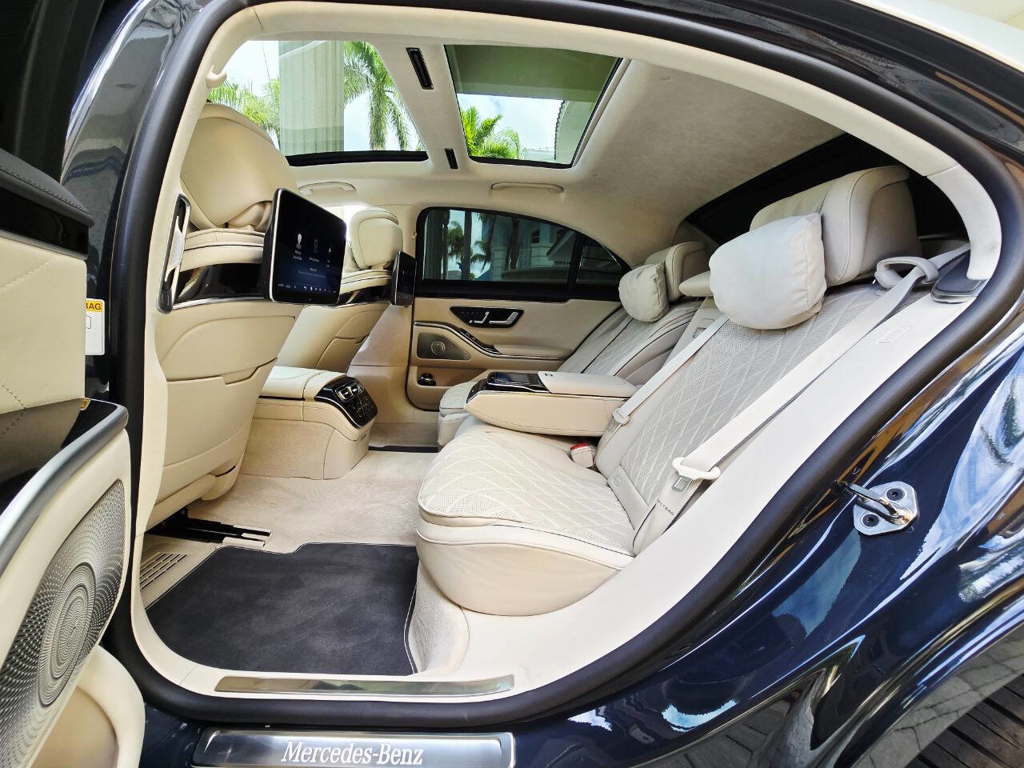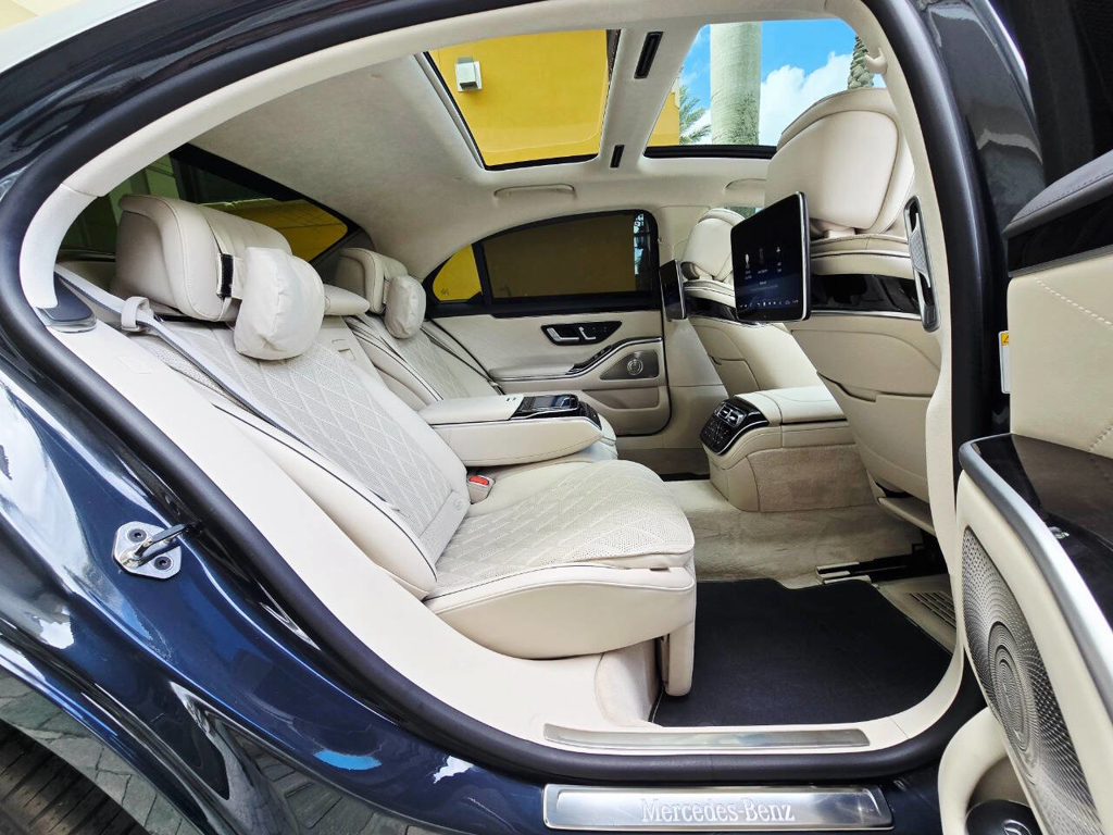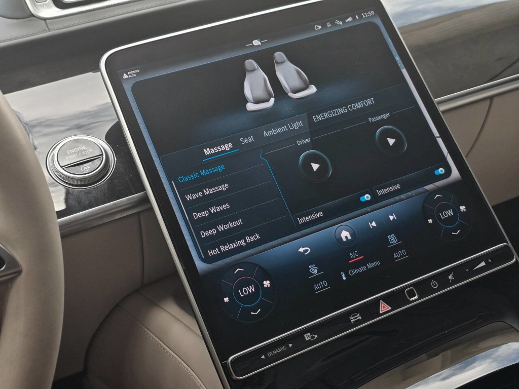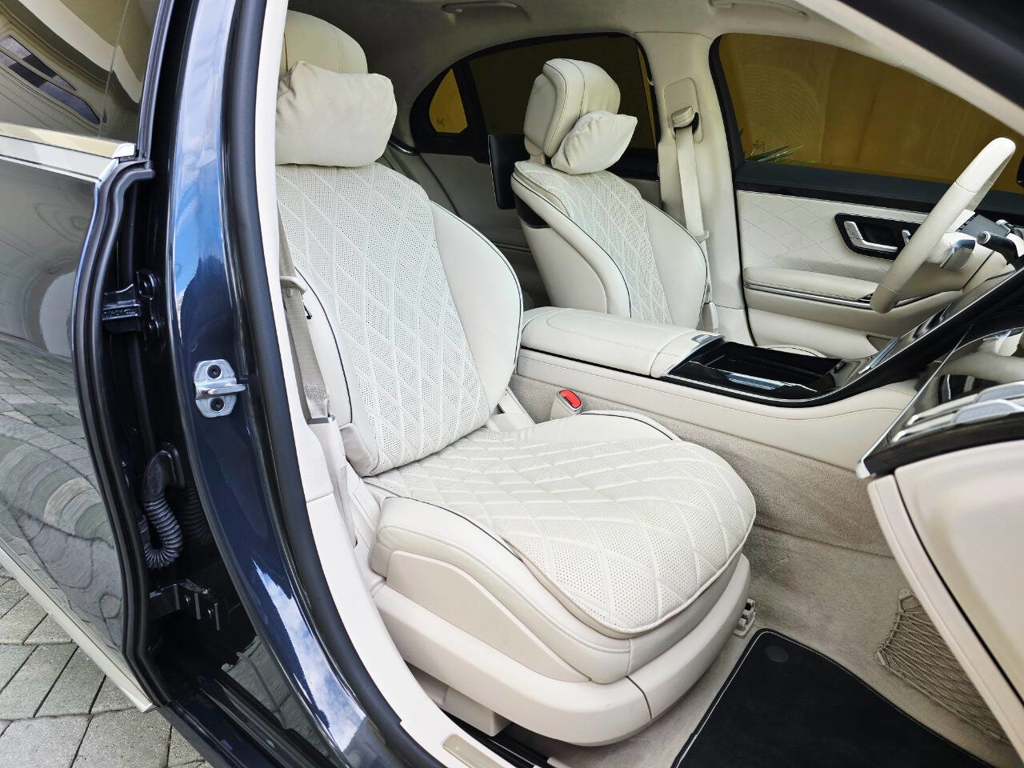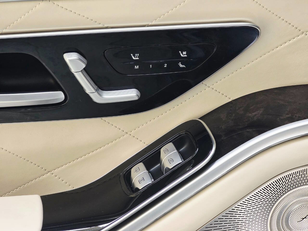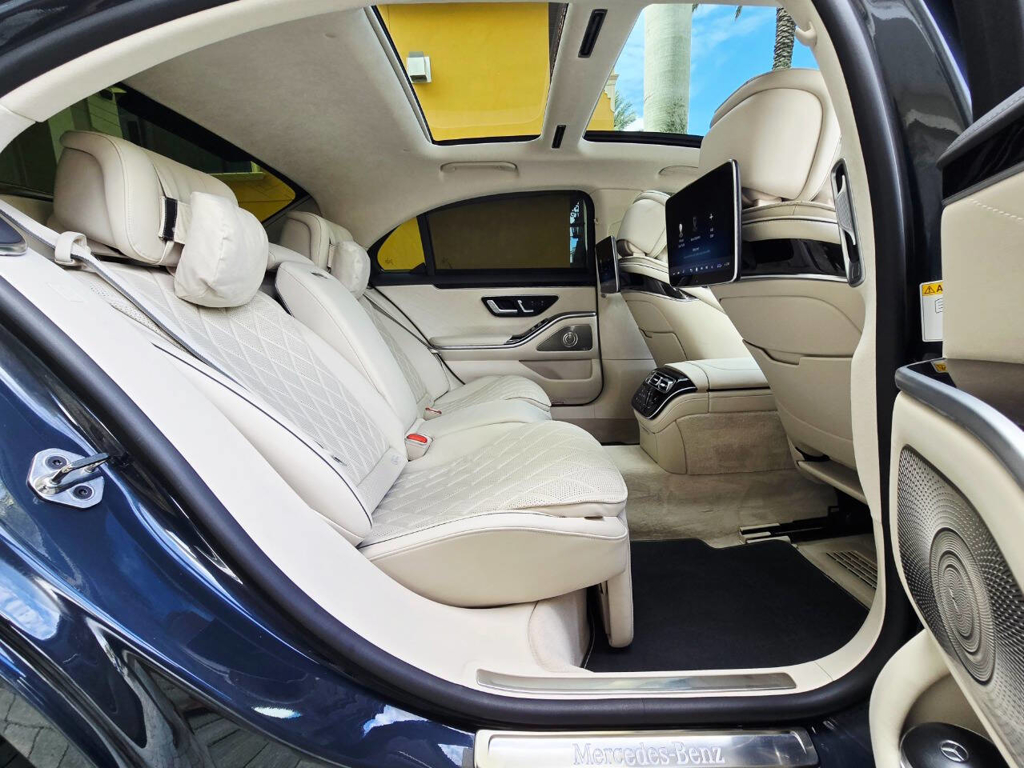 Step inside, and the cabin presents an equally captivating narrative. This particular S580 is optioned with the stunning Macchiato Beige and Magma Grey Exclusive Nappa Leather upholstery, a $3,110 factory option that elevates the interior to the upper echelon of Mercedes-Benz design. Accented with Slate High Gloss Wood Trim, every surface feels handcrafted and thoughtfully curated. Rear passengers are treated to dual rear entertainment displays, part of the $3,400 Rear Seat Entertainment Package, which includes the MBUX High-End Rear Seat Entertainment System and the Rear ENERGIZING package to stimulate comfort and relaxation during long journeys.