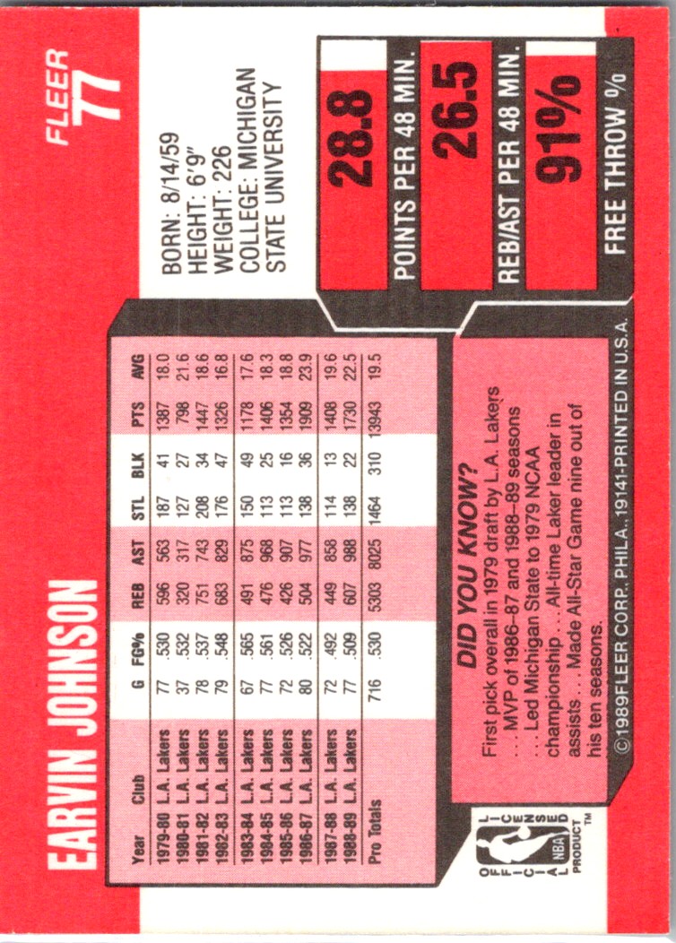 1989-90 Fleer Earvin Johnson Los Angeles Lakers #77