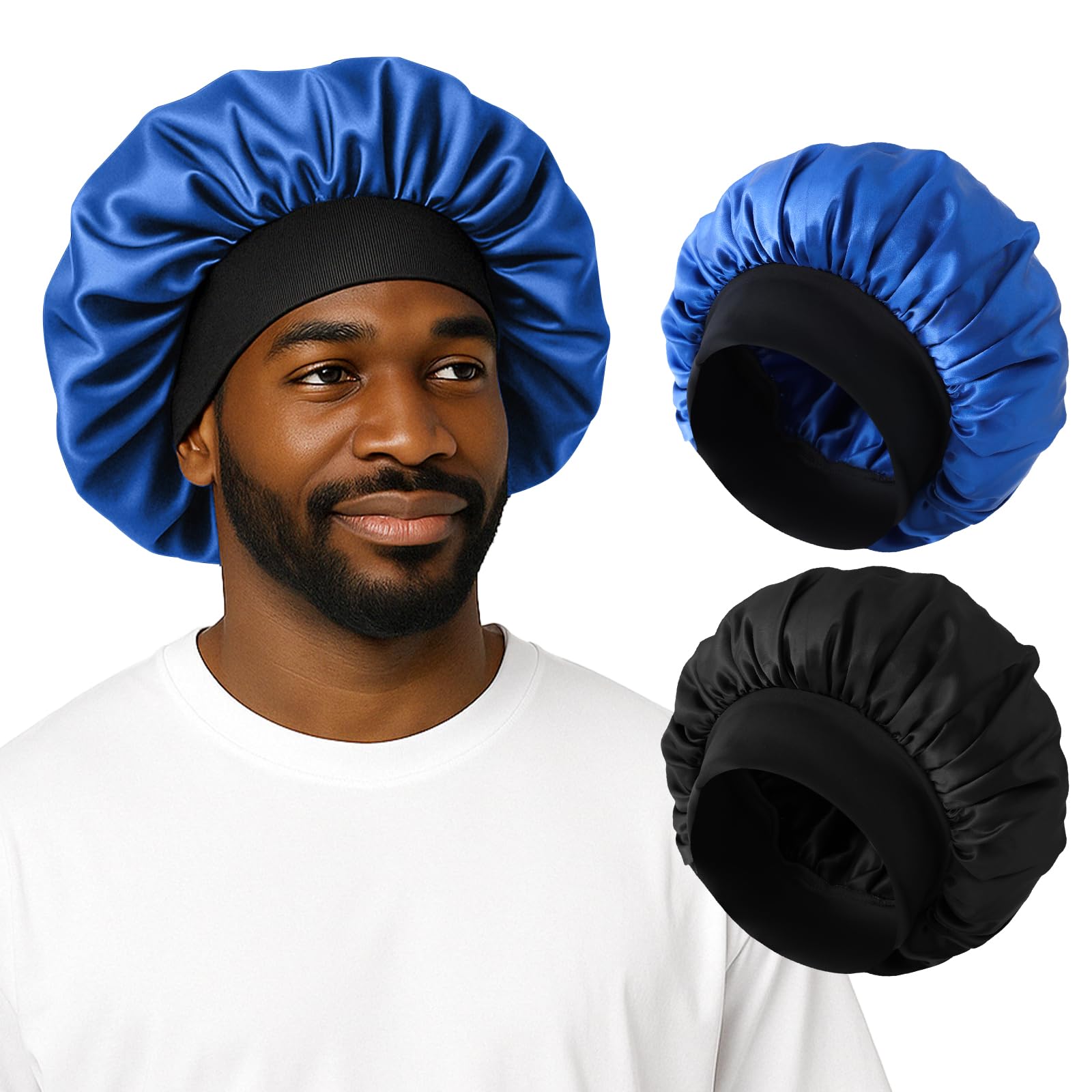 Designed specifically for men, this 2-pack satin sleep bonnet offers smooth hair protection without sacrificing comfort or style. The soft, lightweight fabric reduces friction and breakage while locking in moisture, keeping curls, braids, locs, and dreads looking fresh. With a flexible milk silk elastic band, each bonnet comfortably fits most head sizes without feeling too tight. Whether you're sleeping, relaxing, or working from home, this bonnet stays in place and protects your hair all night. Each pack includes black and gray color options to rotate throughout the week. Machine washable and built for daily use.
