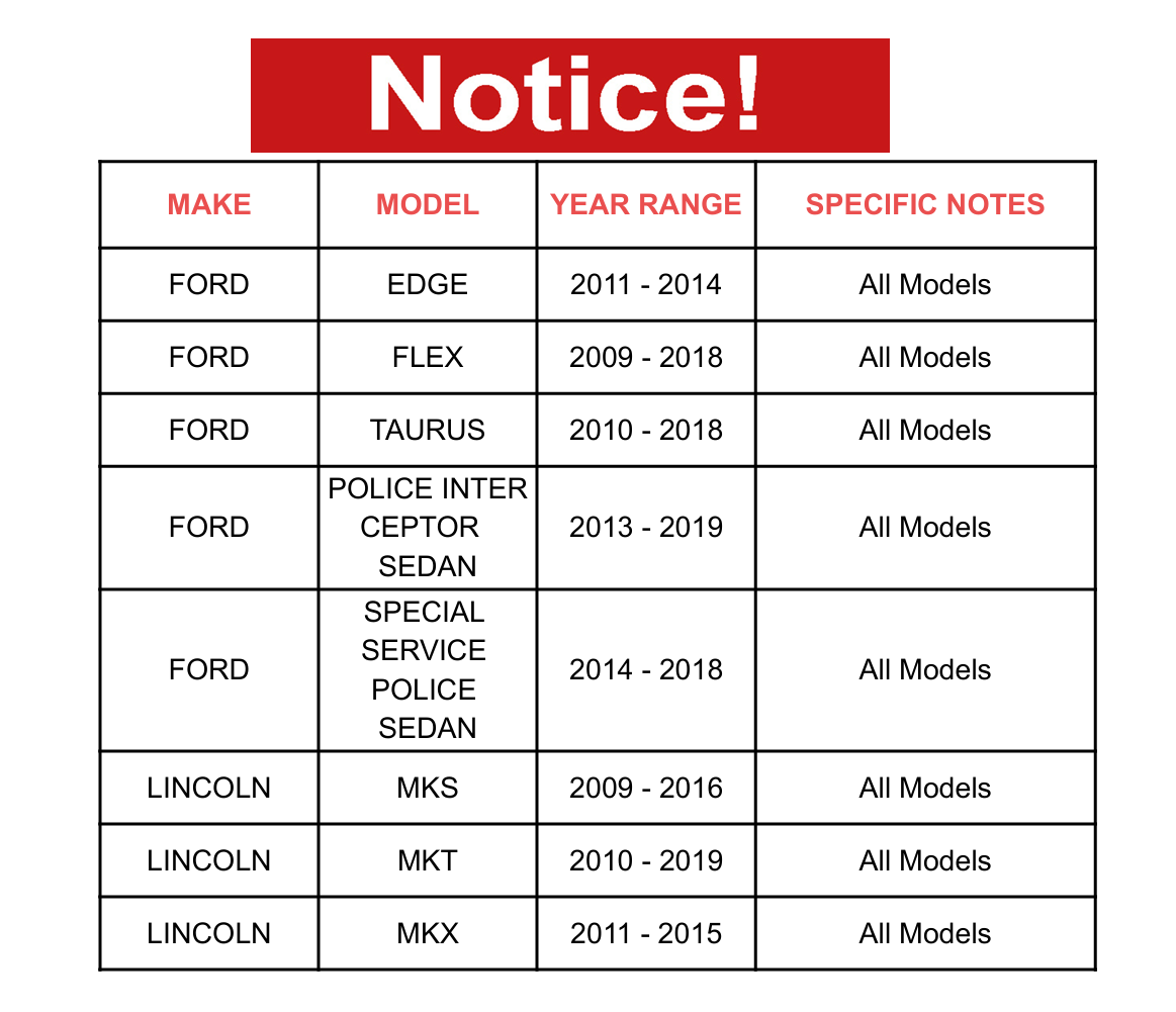 | FORD | SPECIAL SERVICE POLICE SEDAN | 2014 - 2018 | All Models |