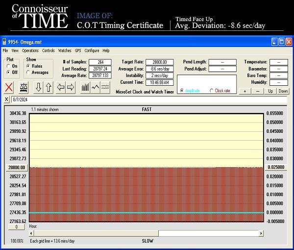 Chronométrage : Chronométré avec précision sur un système informatisé de pointe. Elle fonctionne de manière exceptionnellement solide et fidèle, gardant l'heure presque à égalité avec une nouvelle montre Omega dans notre position d'enregistrement de test.