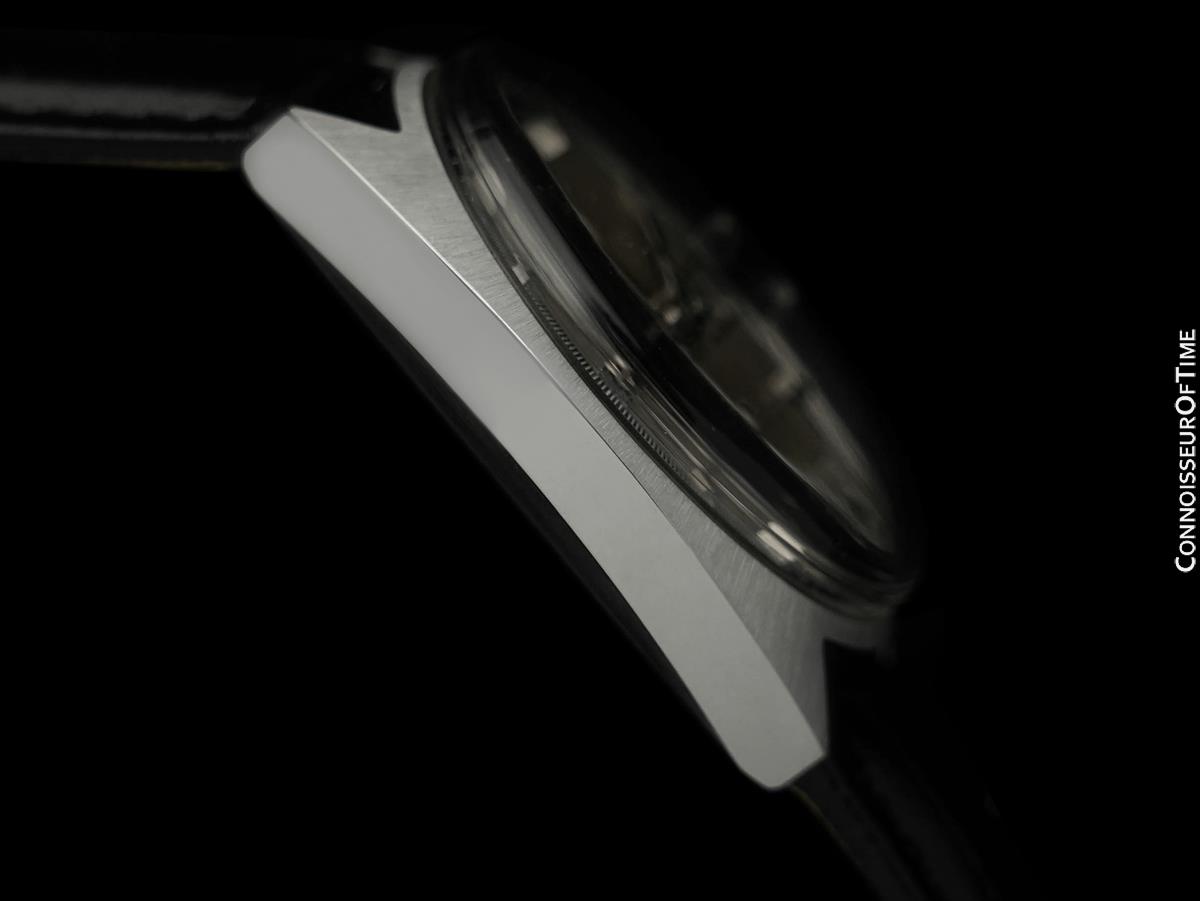 Cadran: Argent et noir, index bâtons larges rétro en acier, piste extérieure des minutes/secondes avec marquages ​​1/5 de seconde pour un chronométrage précis, signé Omega, original et intact, état neuf