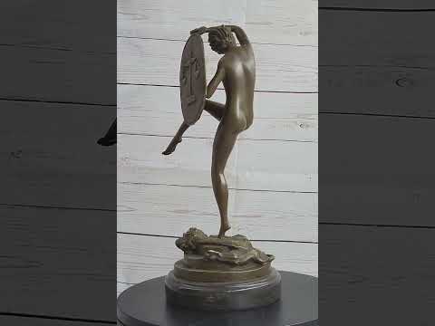 Diese beeindruckende Bronzeskulptur stellt eine nackte Kriegerin dar, die furchtlos mit Schild und Schwert in der Hand steht und jeder potenziellen Bedrohung gewachsen ist. In einer dynamischen, werferähnlichen Haltung steht sie mit angehobenem Bein auf den Fußballen und fängt einen Moment der Stärke, Beweglichkeit und Entschlossenheit ein. Unter ihr liegt die gehäutete Haut eines Löwen – ein unverkennbares Symbol ihres Triumphs und ihrer Wildheit. Obwohl ihr Gesichtsausdruck einen Anflug von Wachsamkeit zeigt, bleibt sie ruhig und selbstbewusst und ist sich ihrer eigenen Macht voll bewusst.