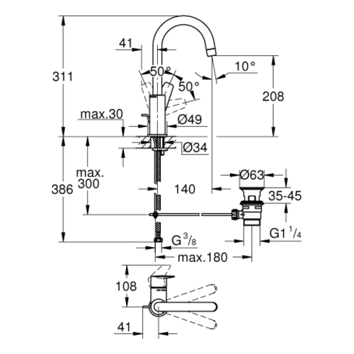 Grohe BauEdge Einhand-Waschtischbatterie, L-Size, Ausladung 140mm, Zugstangen-Ablaufgarnitur, schwenkbar, 23760001