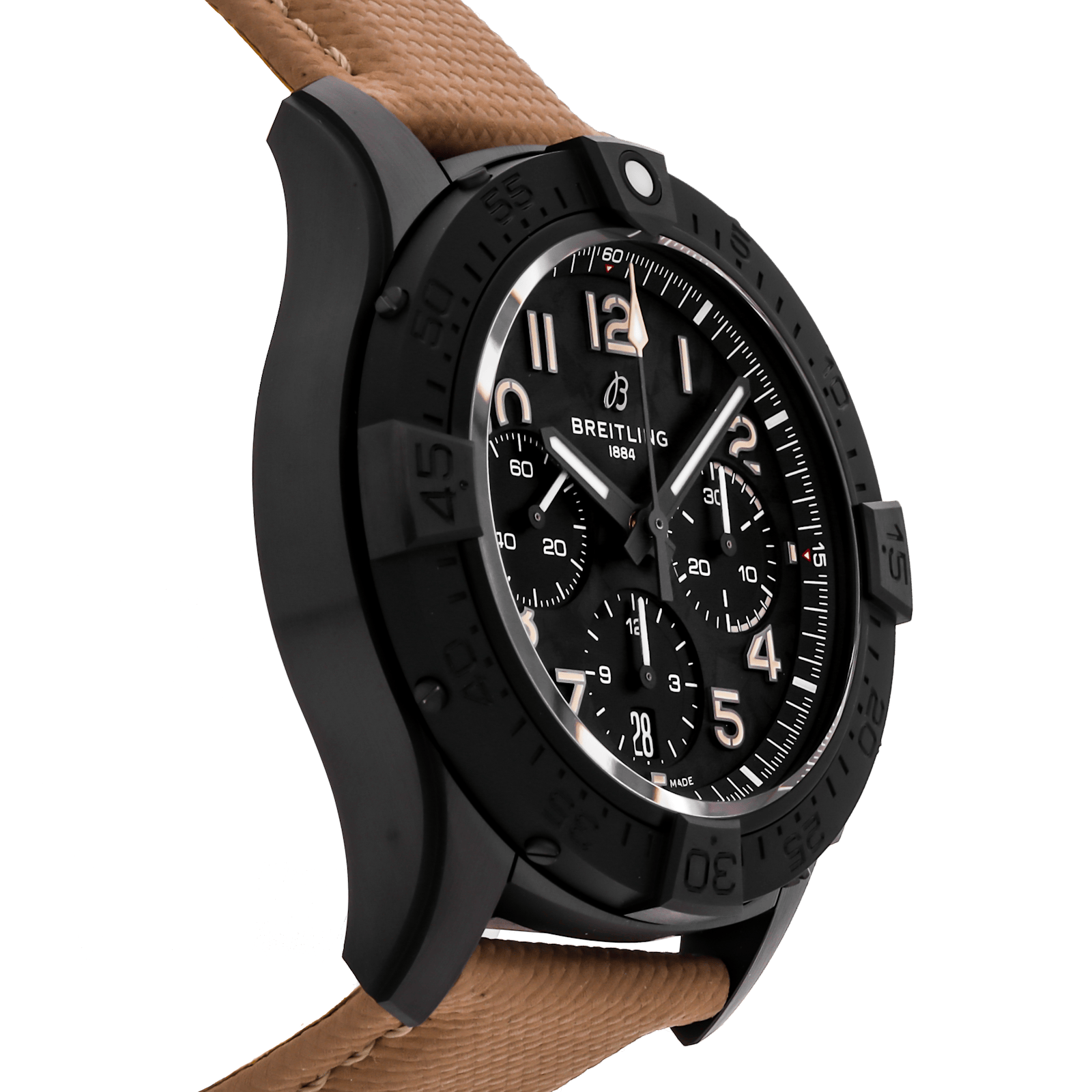 Montre automatique à remontage automatique Breitling Avenger B01 Chronograph Night Mission (SB0146101B1X1) d'occasion, dotée d'un boîtier en céramique noire de 42 mm entourant un cadran aspect carbone noir avec des compteurs noirs. La montre est fixée sur un bracelet en cuir de veau militaire de couleur sable avec une boucle déployante en titane. Les fonctions incluent les heures, les minutes, les secondes, la date et le chronographe. Cette montre est livrée complète avec la boîte et les papiers d'origine. Temps restant sur la garantie d'usine !
