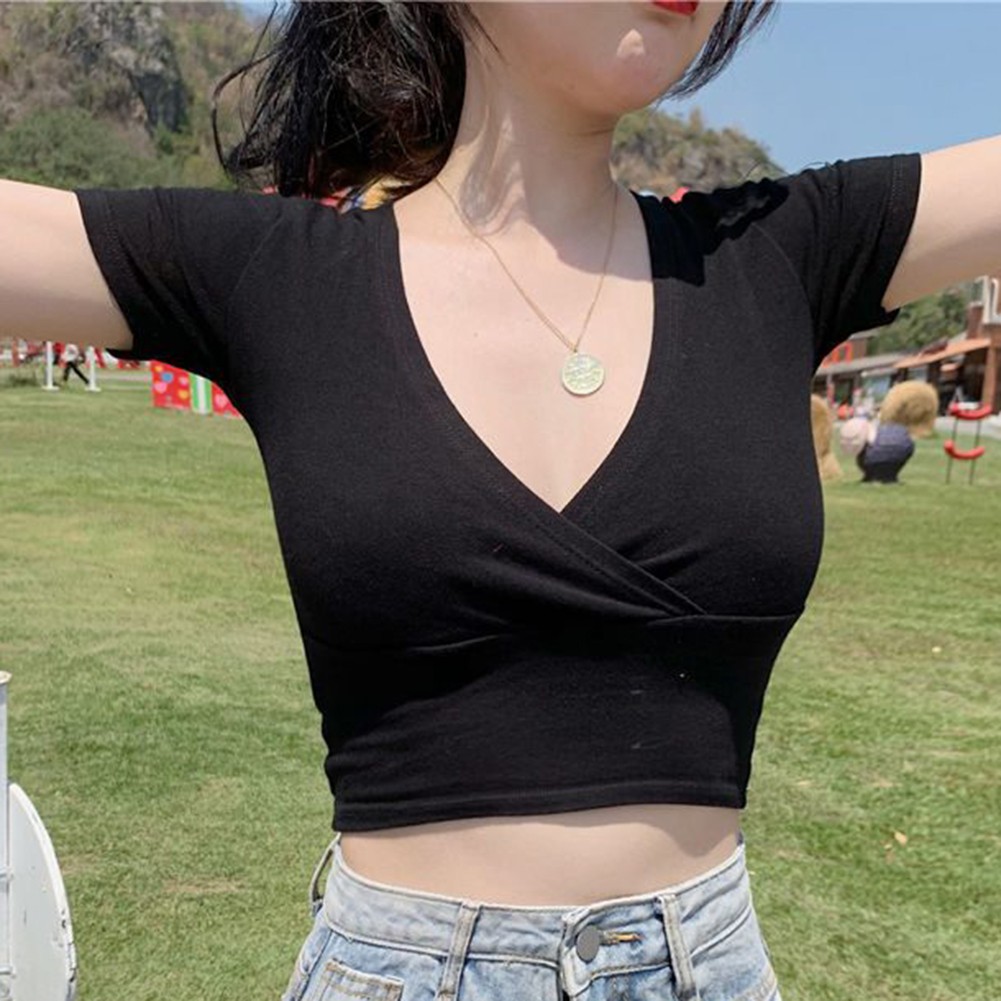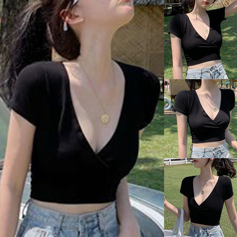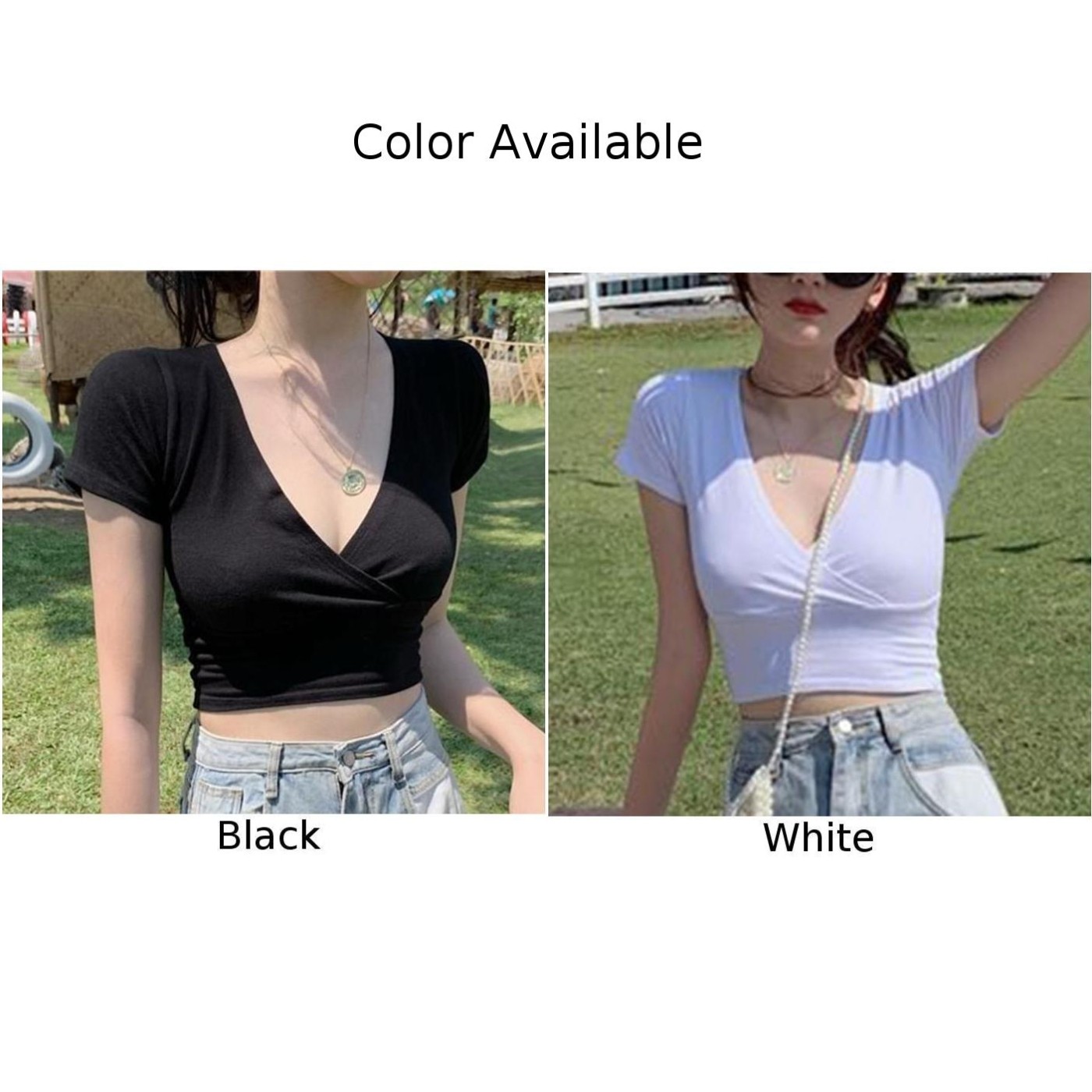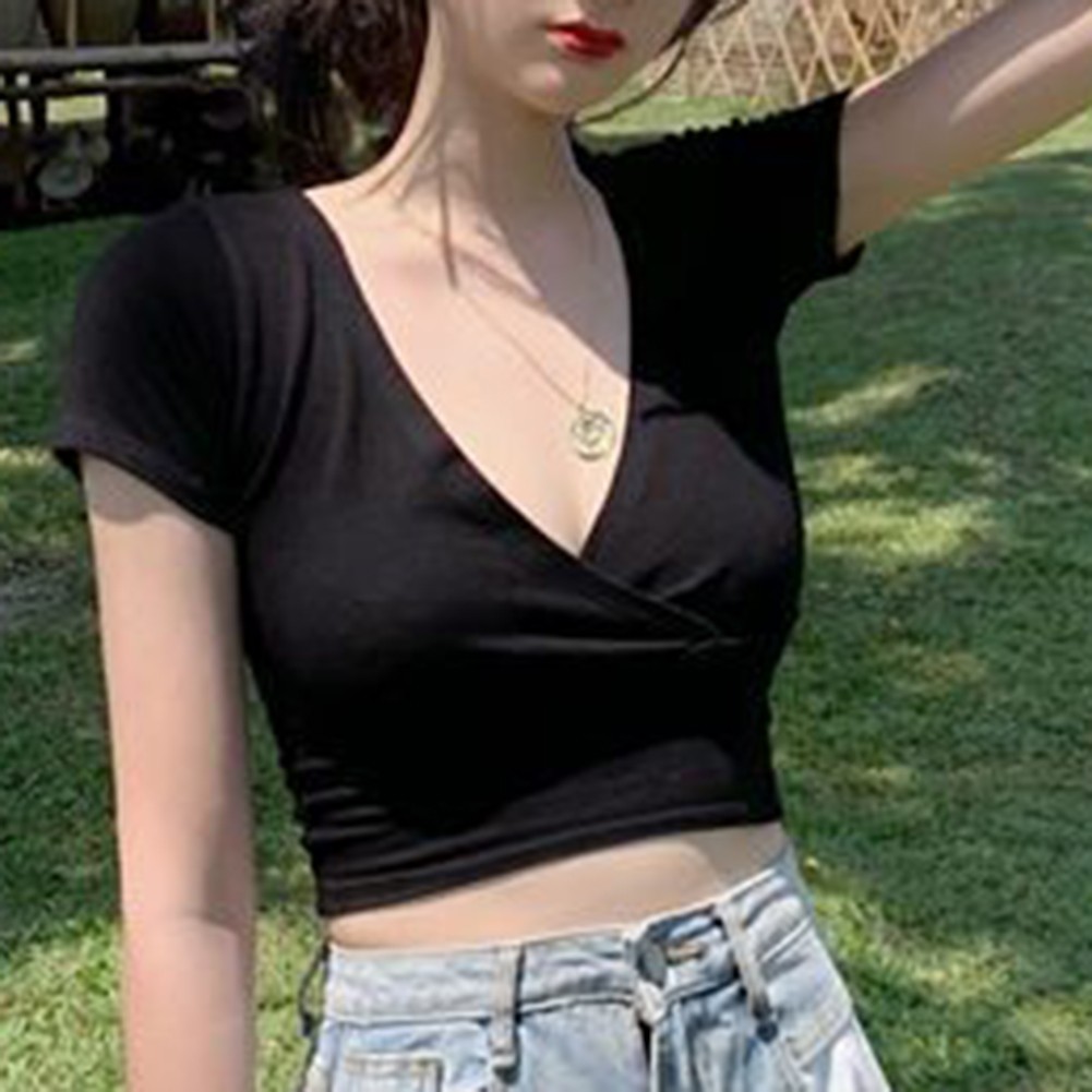 * Caractéristiques du produit : Femmes,T-shirt à manches courtes à col en V couleur unie mince pour l'été,Top court pour fille à la mode