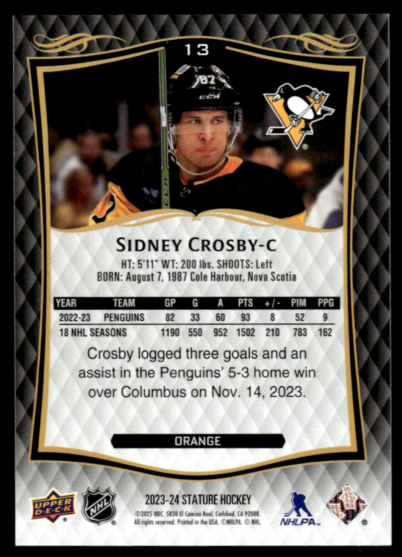 | 2023-24 Upper Deck Stature Orange Sidney Crosby 183/199 #13 | ||||||||||||||||