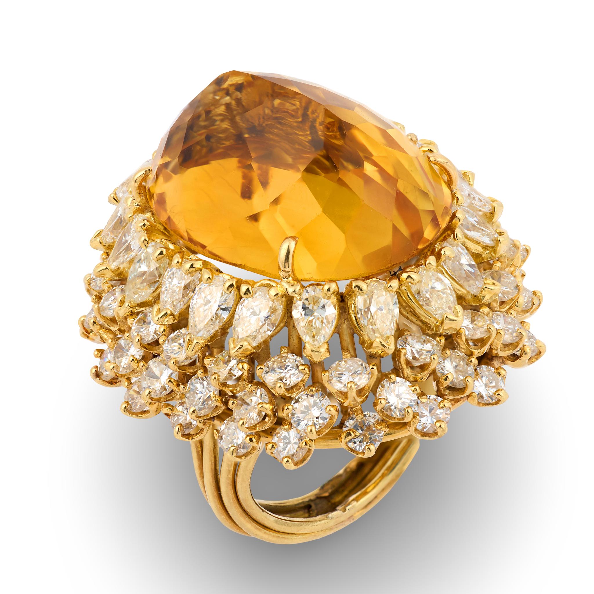 This extraordinary vintage cocktail ring embodies the bold glamour and expressive luxury that defined the 1980s. At its center rests a breathtaking 24-carat oval faceted cabochon citrine, glowing with a sun-drenched warmth that immediately draws the eye. Its expansive surface creates a radiant pool of golden light, giving the stone a commanding presence that feels both opulent and enchanting.