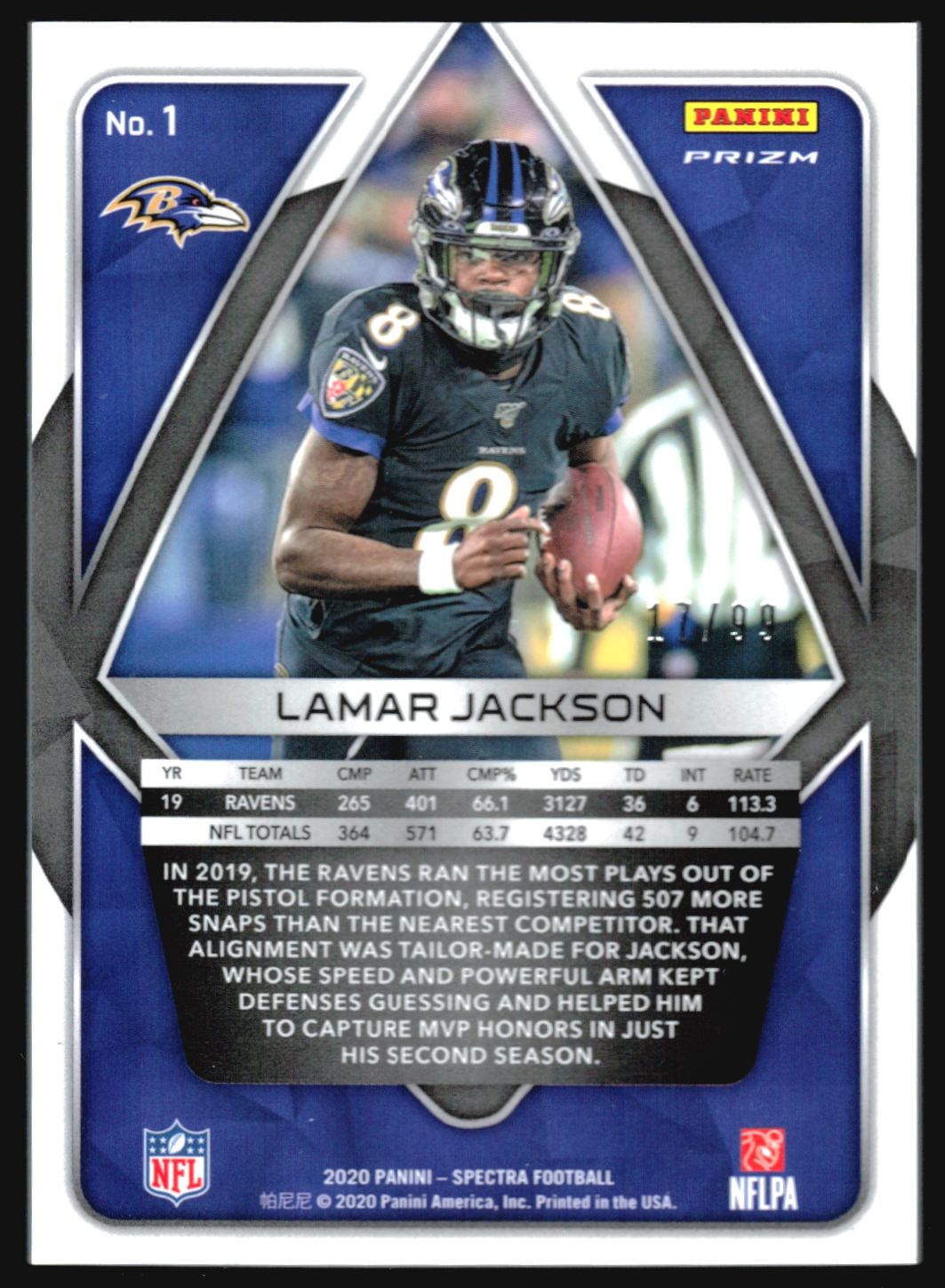 | 2020 Panini Spectra LAMAR JACKSON Silver Prizm /99 #1 | ||||||||||||||||||