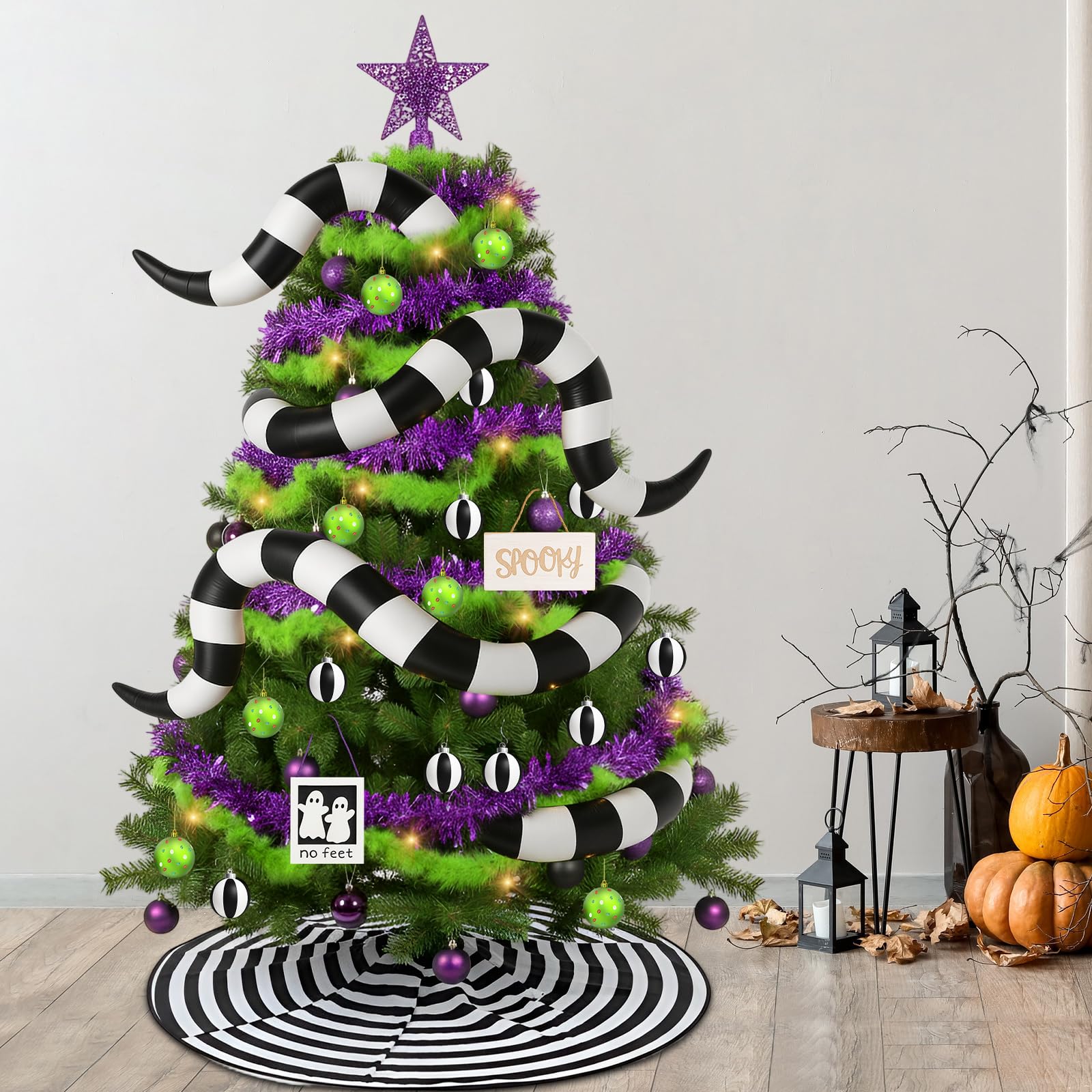 Unique Design and Atmosphere: this Christmas black and white striped sandworm can be hidden between the gaps of the tree, creating the illusion that the sandworm is moving between the branches, enhancing the horror atmosphere of the Halloween tree; The matching tree skirt and ribbons add a sense of spooky atmosphere