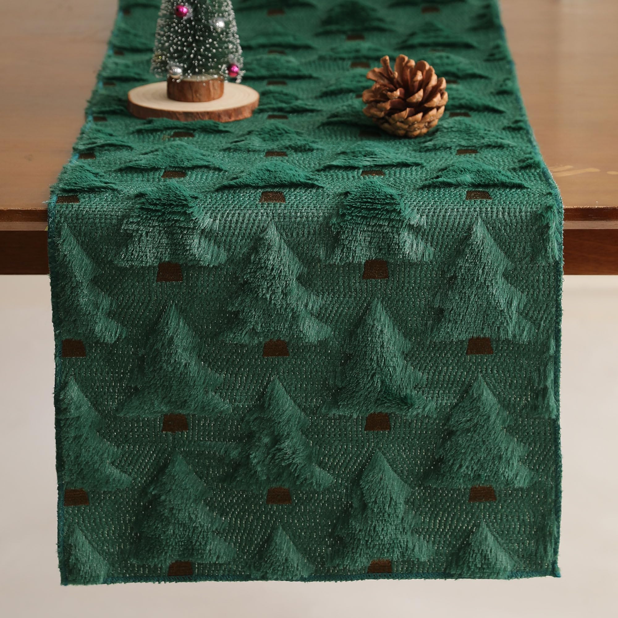 Christmas Tbale Runner 13x72 Inch Soft Plush Faux Fur Jacquard Green Christmas Tree Table Runner, Seasonal Autumn Kitchen Dining Table Decoration for Home Party Decor ZR001B72