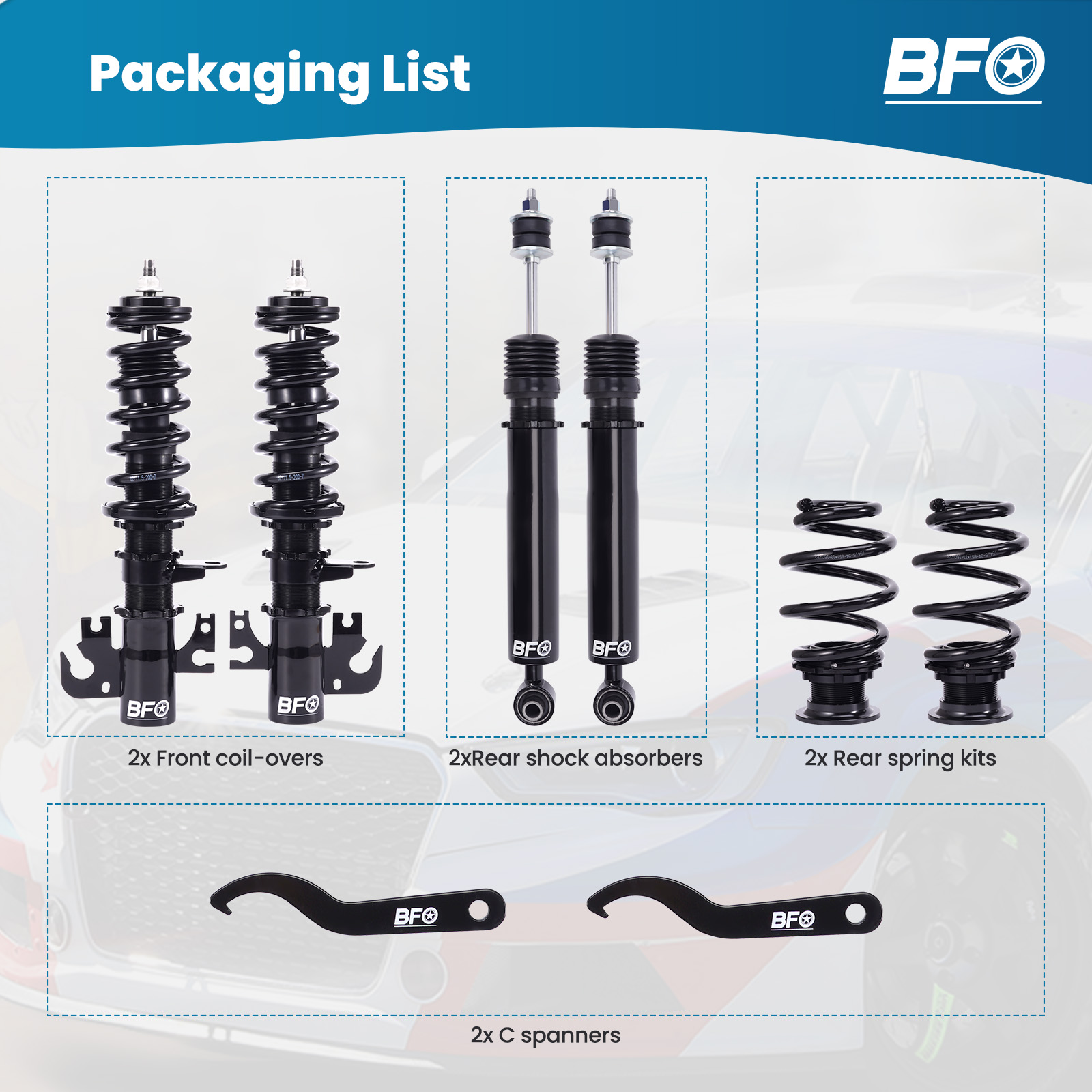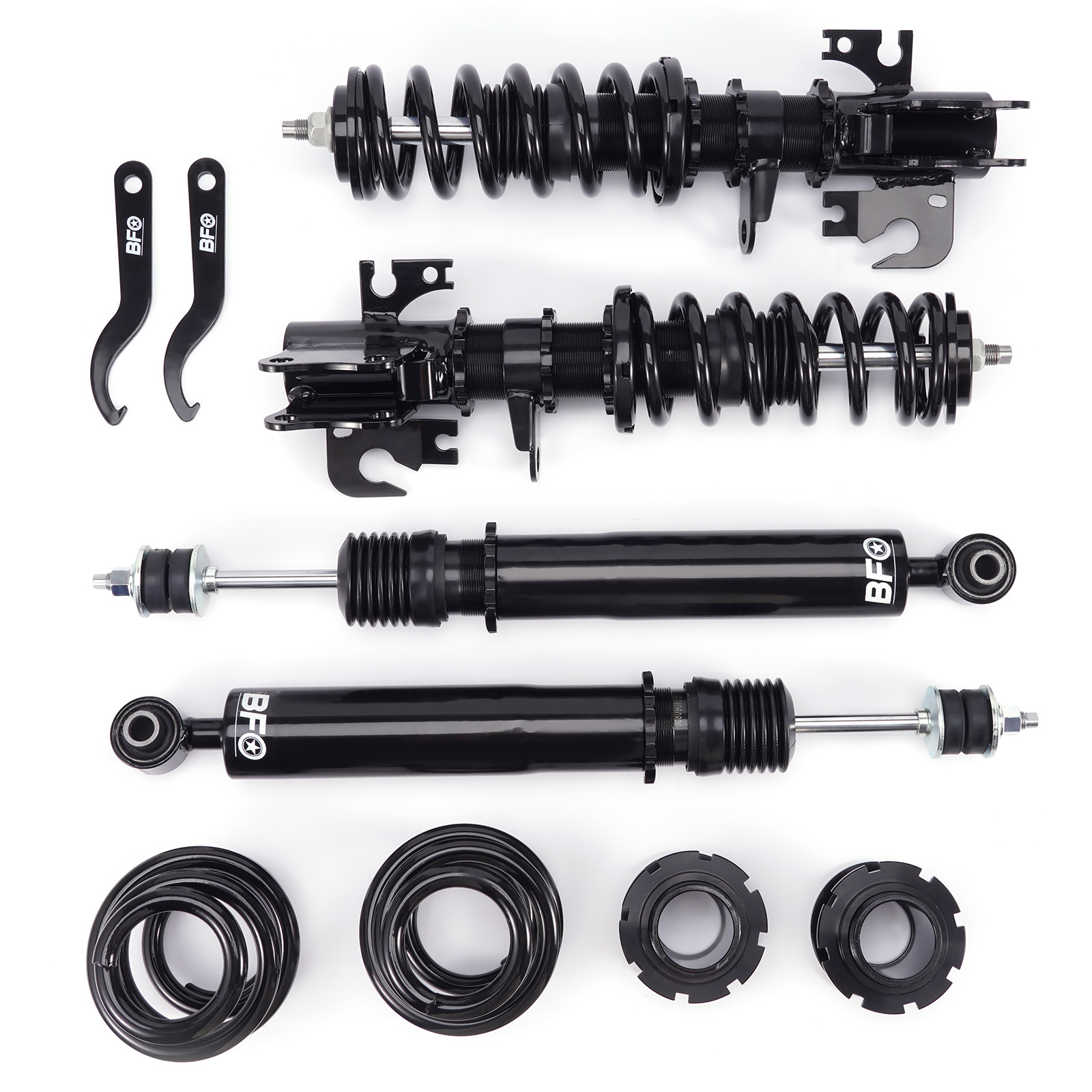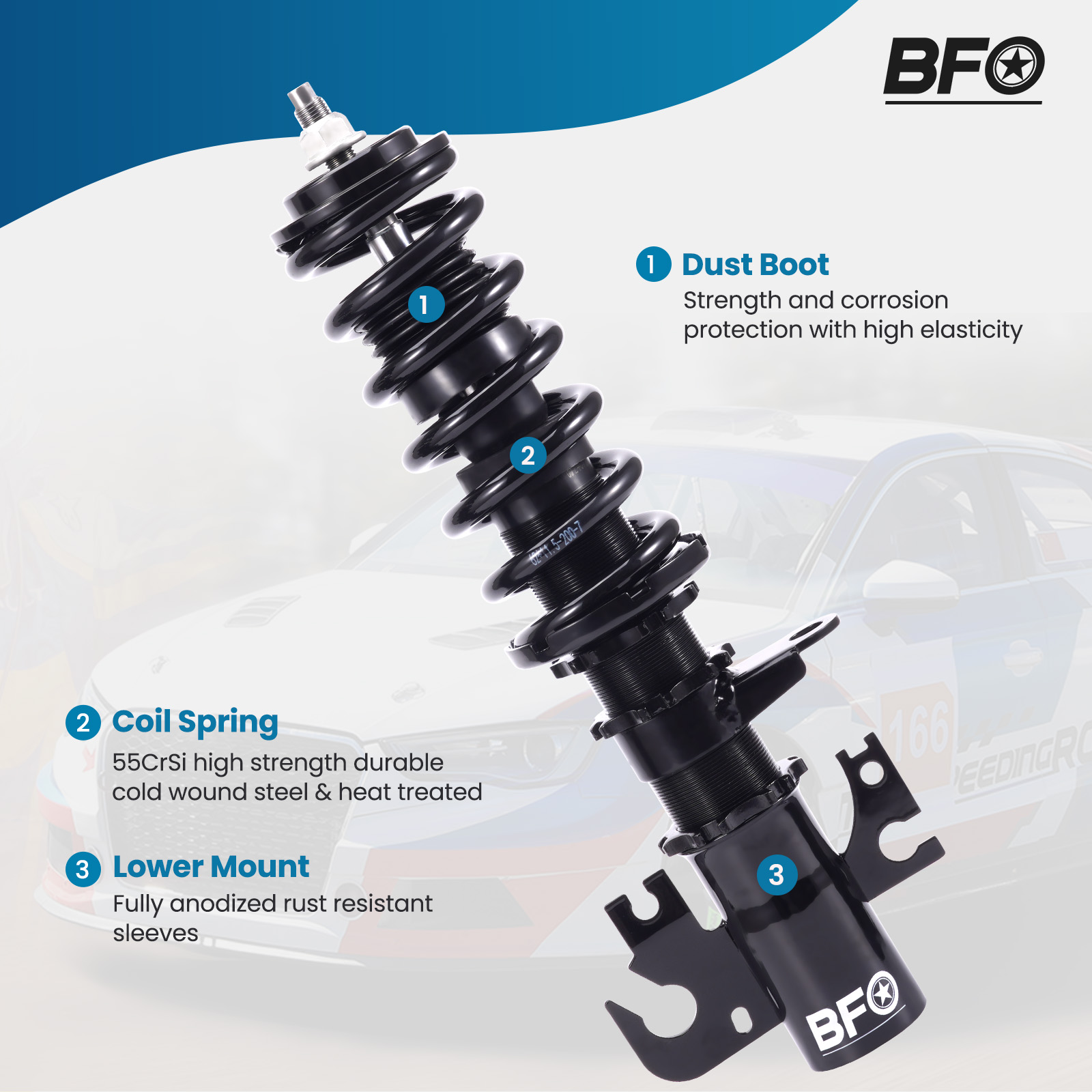 BFCO coil-overs are designed as entry-level for street use. It features height adjustable and adjustable camber plates (applicable for some vehicles), which offer you a lowered stance, and improved performance for your daily use vehicle.