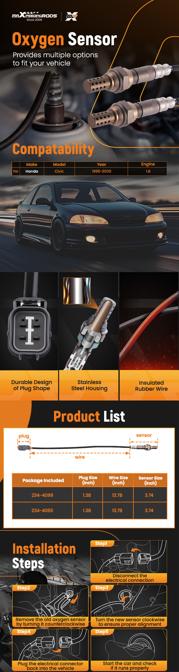 【High Quality Mateial】The oxygen sensor is equipped with a stainless steel housing. Durable and corrosion-resistant, ensuring your engine's long-lasting and stable performance.