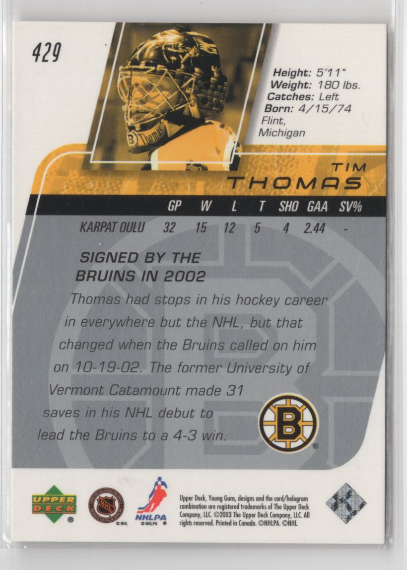 | 2002-03 Upper Deck Young Guns Young Guns Tim Thomas Rookie Boston Bruins #429 | ||||||||||||||||||