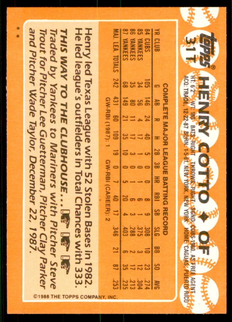 | Description: | Henry Cotto | | Category: | Baseball | | Year: | 1988 | | Product: | Topps Traded | | Team: | Seattle Mariners | | Card Number: | 31T | | Memorabilia: | . | | Special: | | | Dimensions: | 3½" x 2½" |