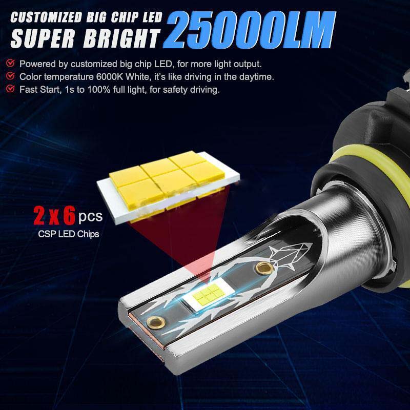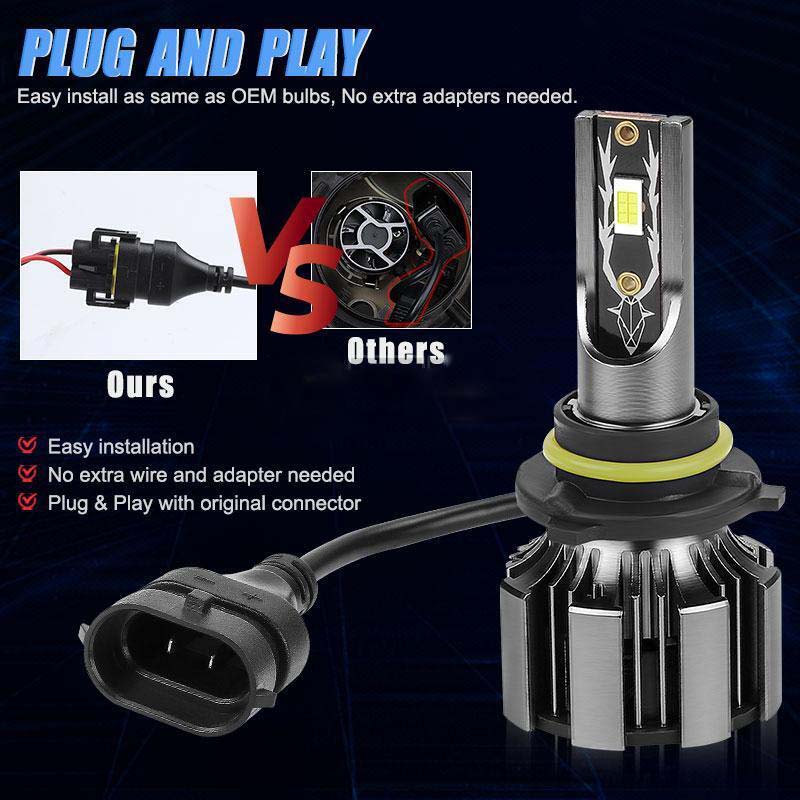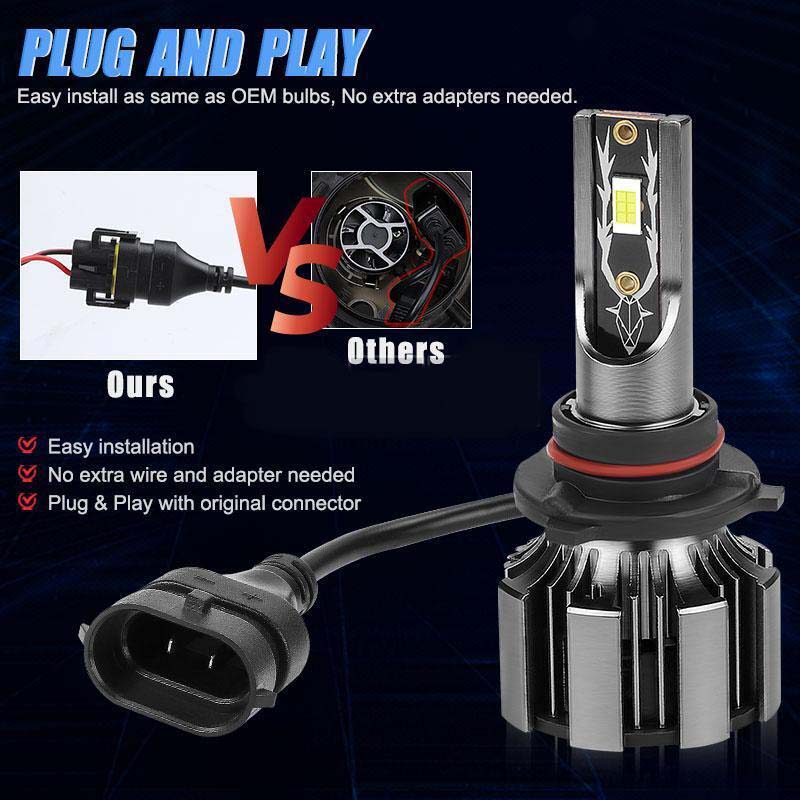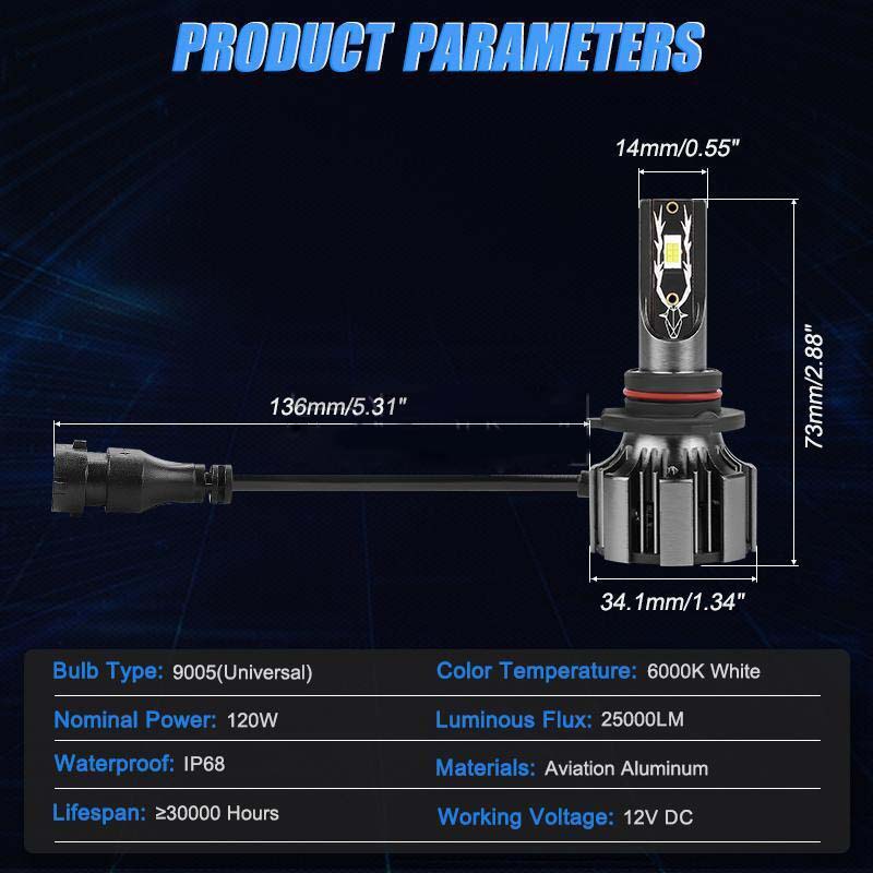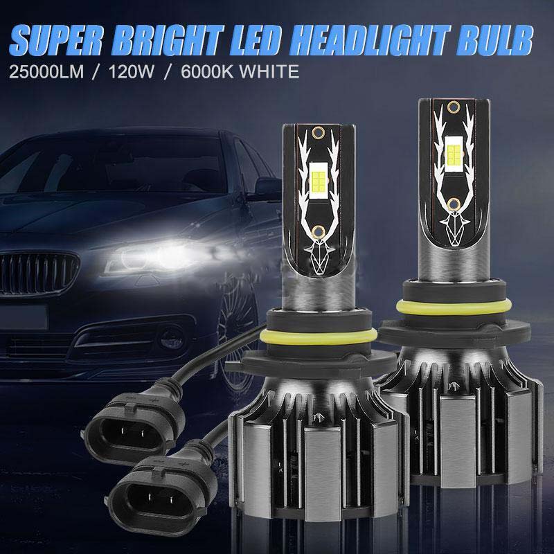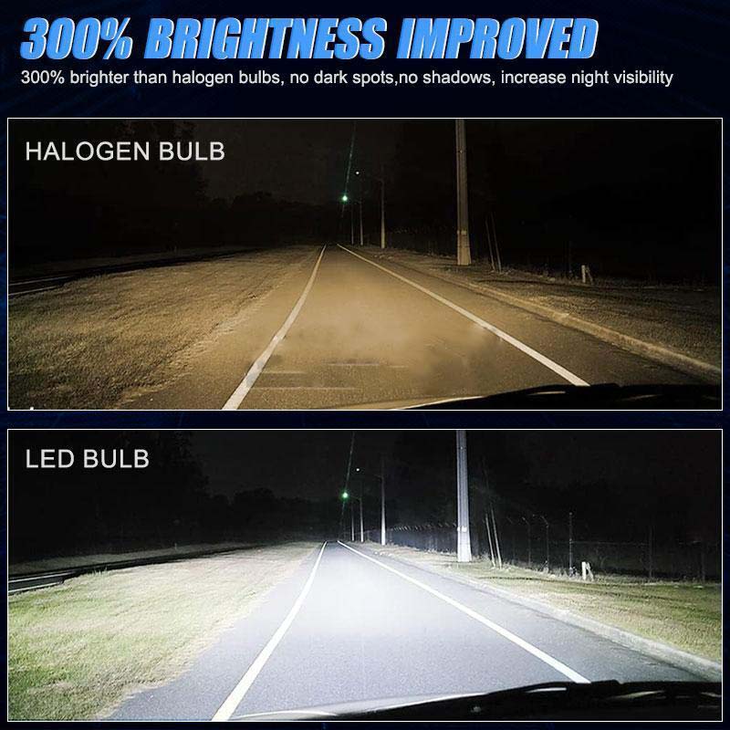 1, 300% BRIGHTER THAN HALOGENS: Superior LED bulbs with high power 120W, 25,000LM per pair. The led headlight bulbs provide to 300% more light with a 6000K cool white clearer color. This 3 times brighter than your original halogen bulb.