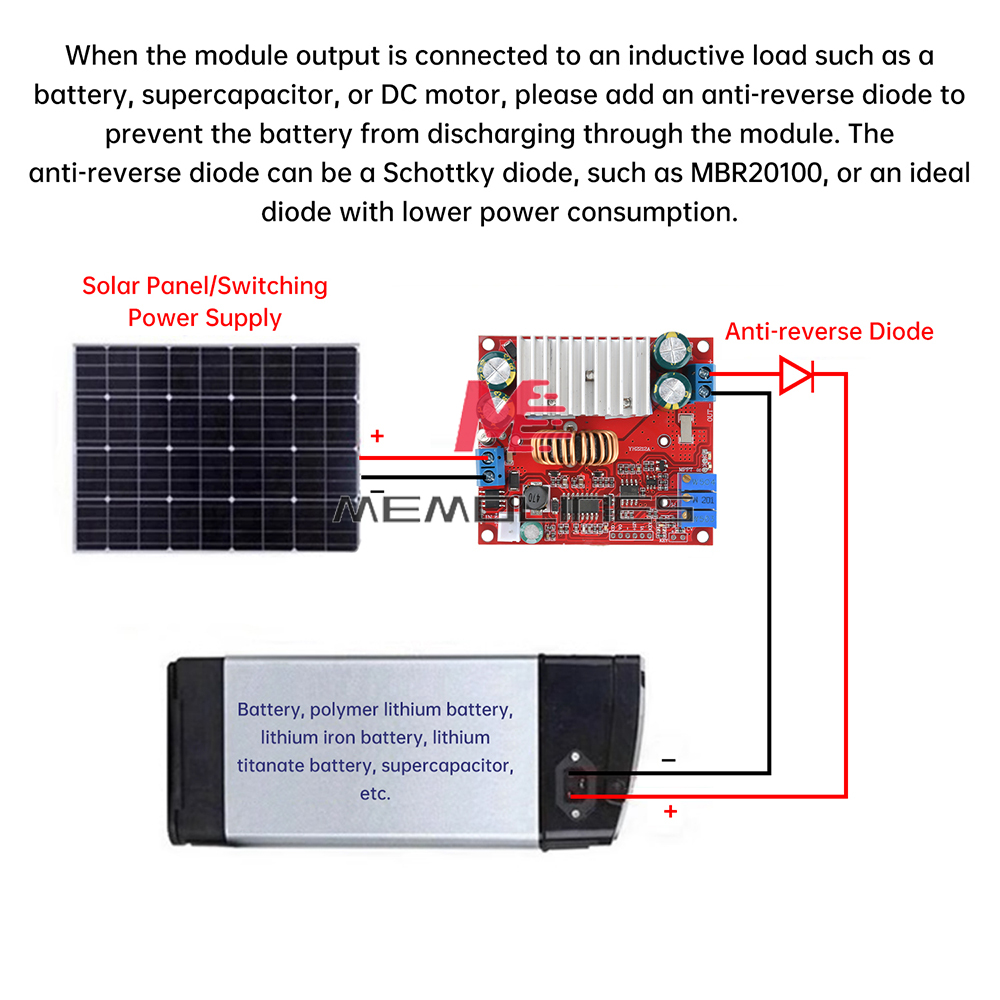 3. When connecting the output of this module to inductive loads such as batteries, supercapacitors, DC motors, etc., please add an anti-reverse filling diode to prevent the battery from discharging through the module. Prevent the battery from discharging through the module.