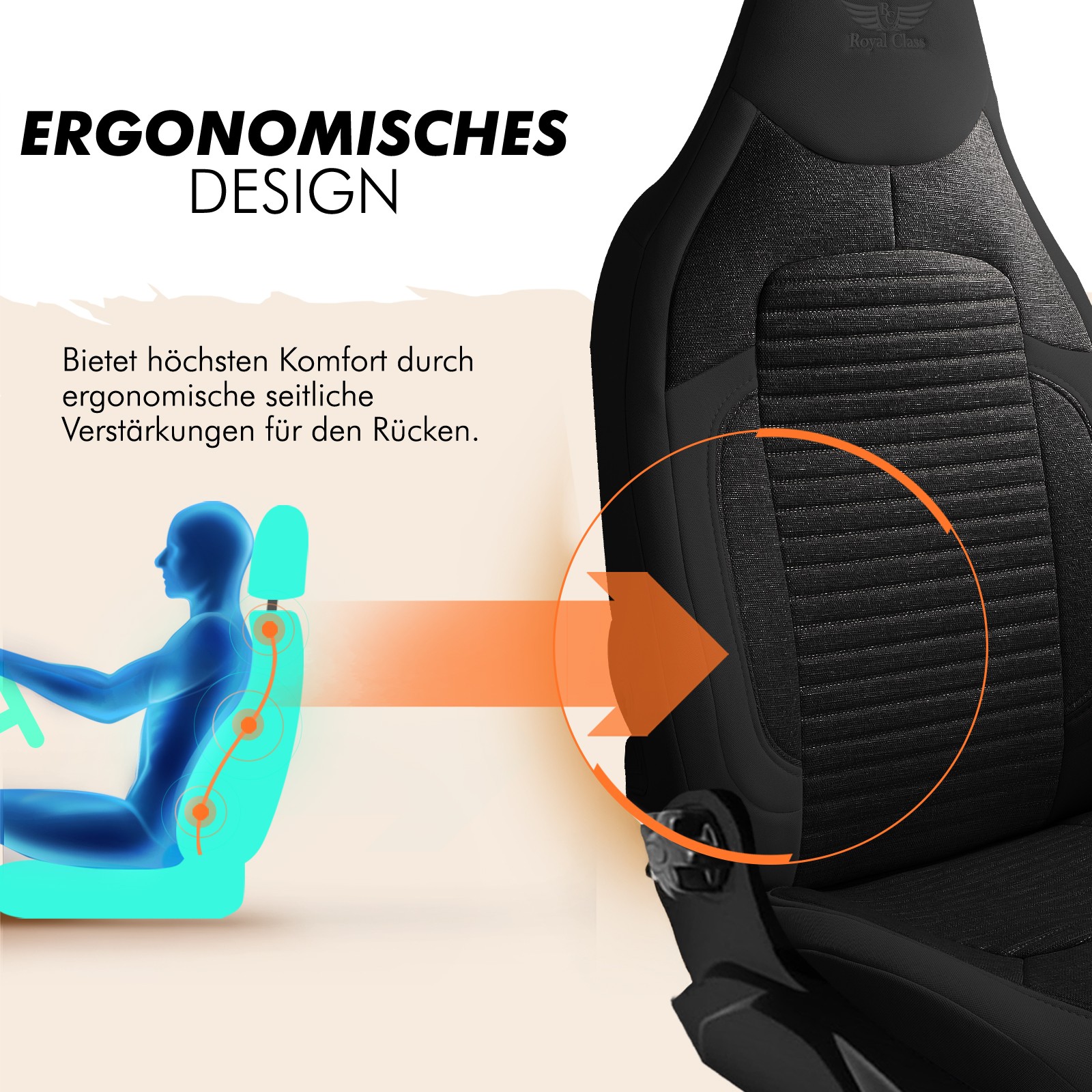 Die RoyalClass Autositzbezüge sind Sitzheizung geeignet und bieten durch verstärkte Flanken und orthopädische Seitenstützen aus Leder mehr Komfort. Die Rückenlehne ist mit 2 großen Taschen ausgestattet, um zusätzlichen Stauraum zu bieten. Darüber hinaus sind sie einfach zu montieren und zu reinigen.
