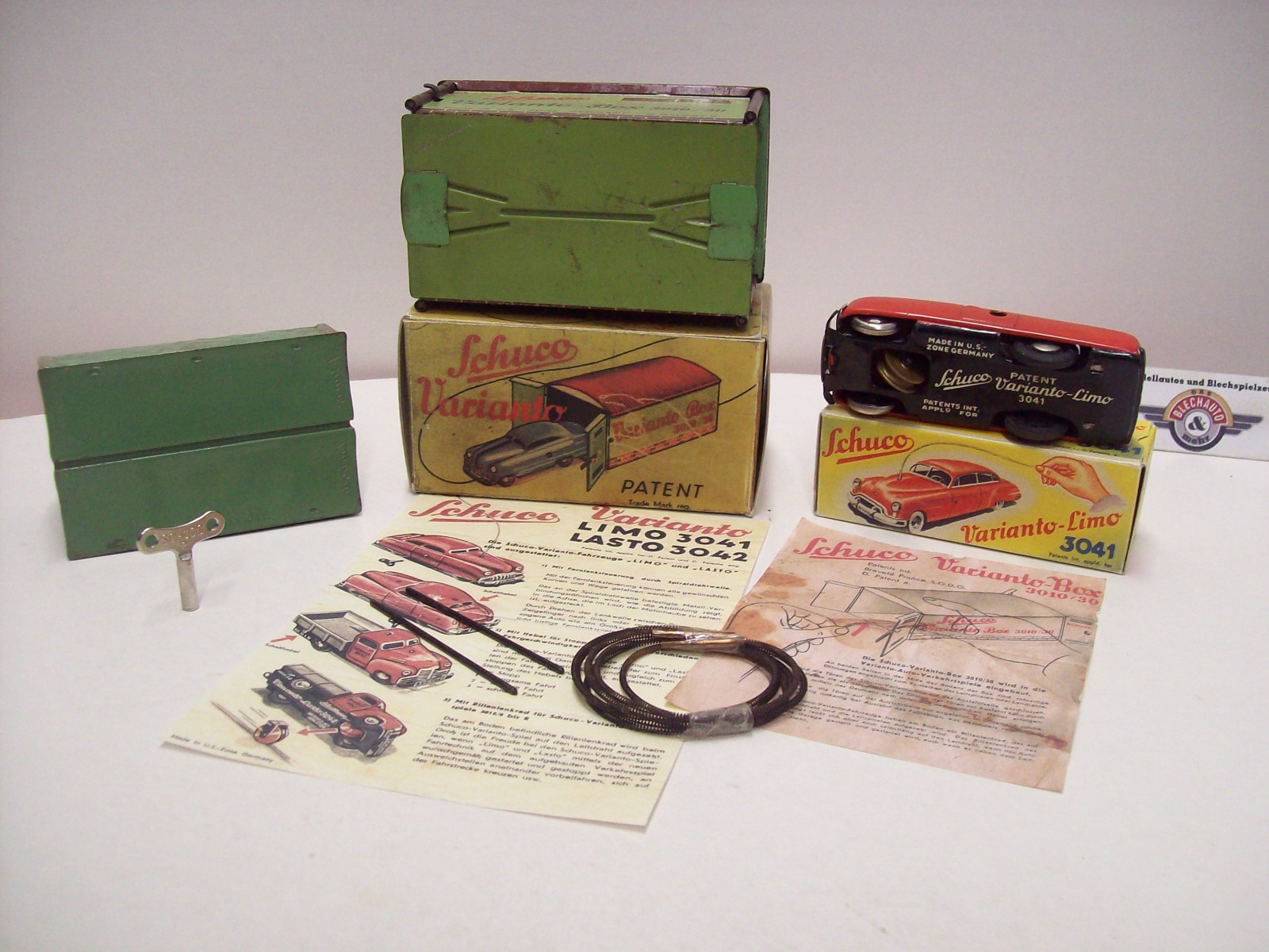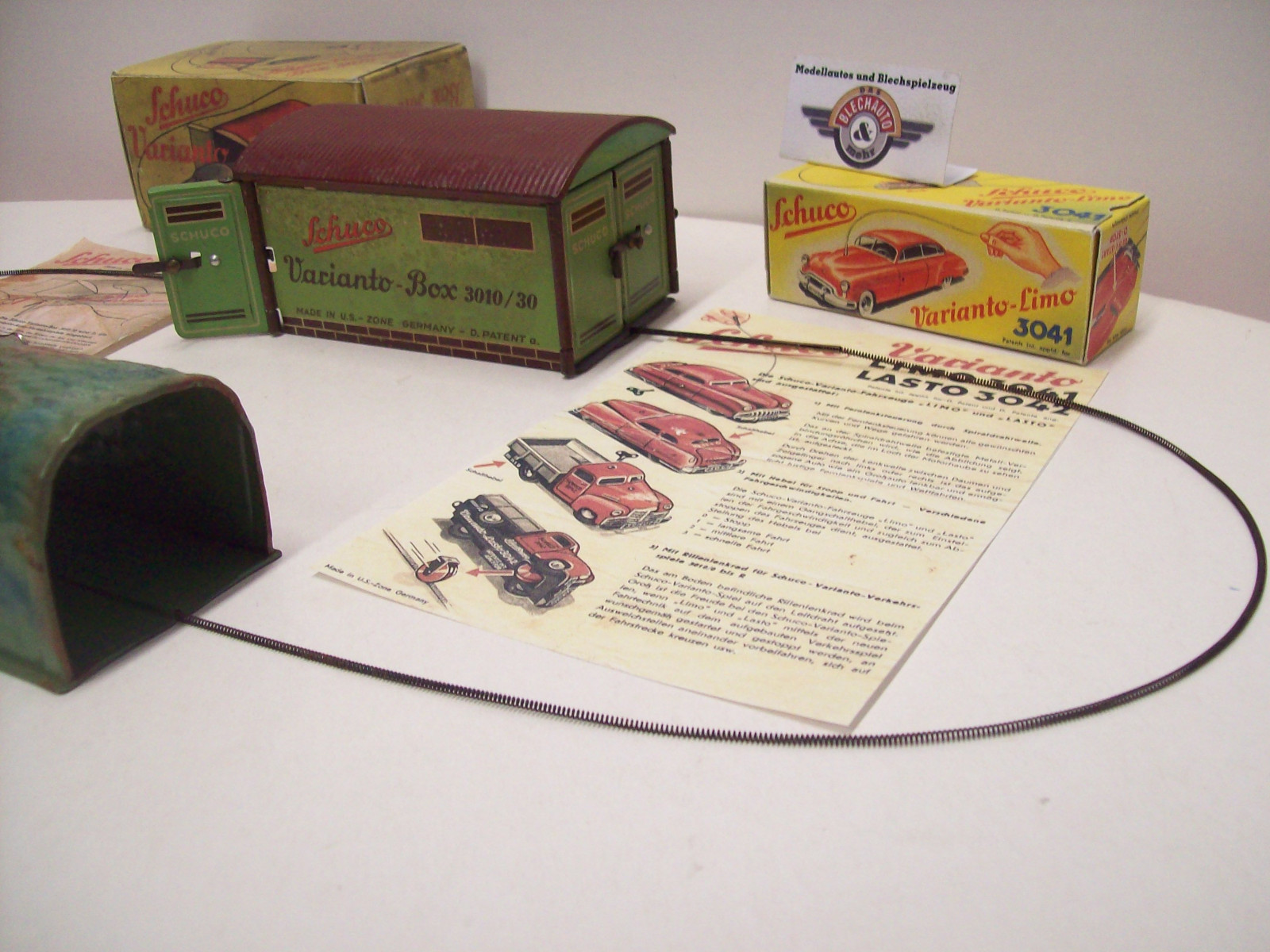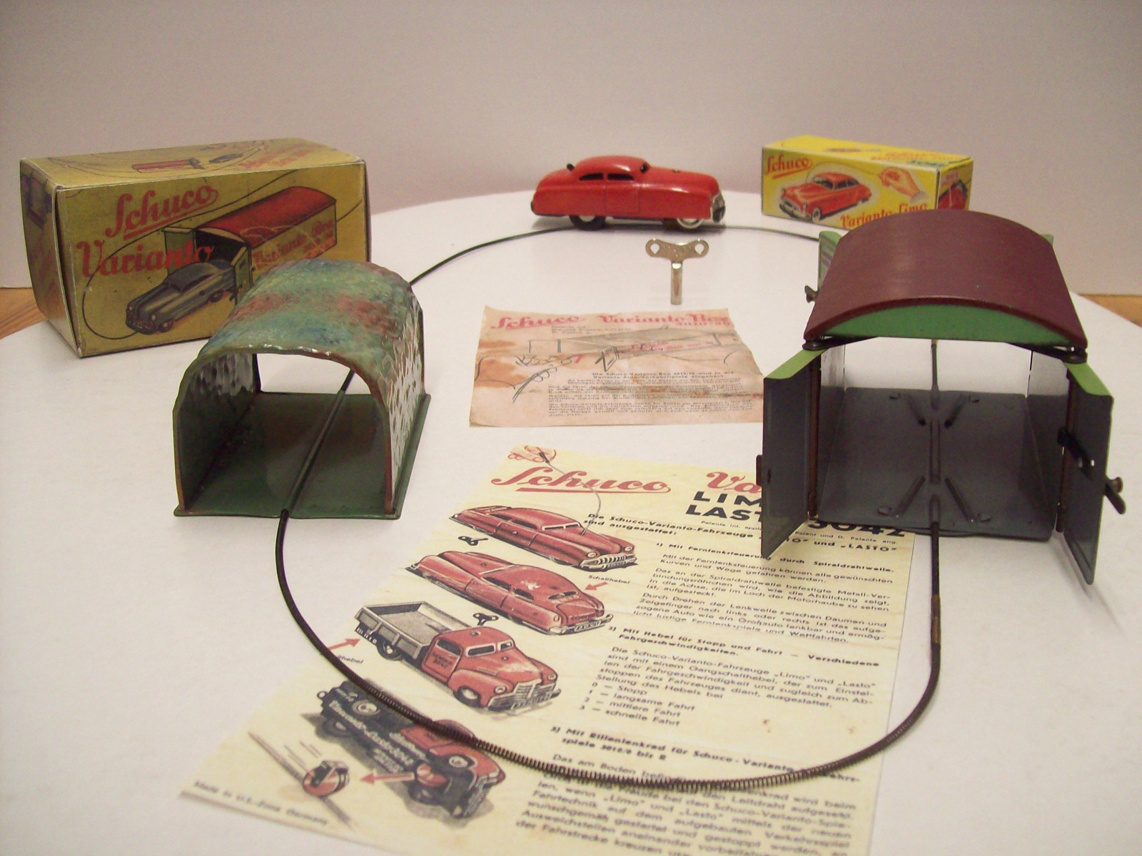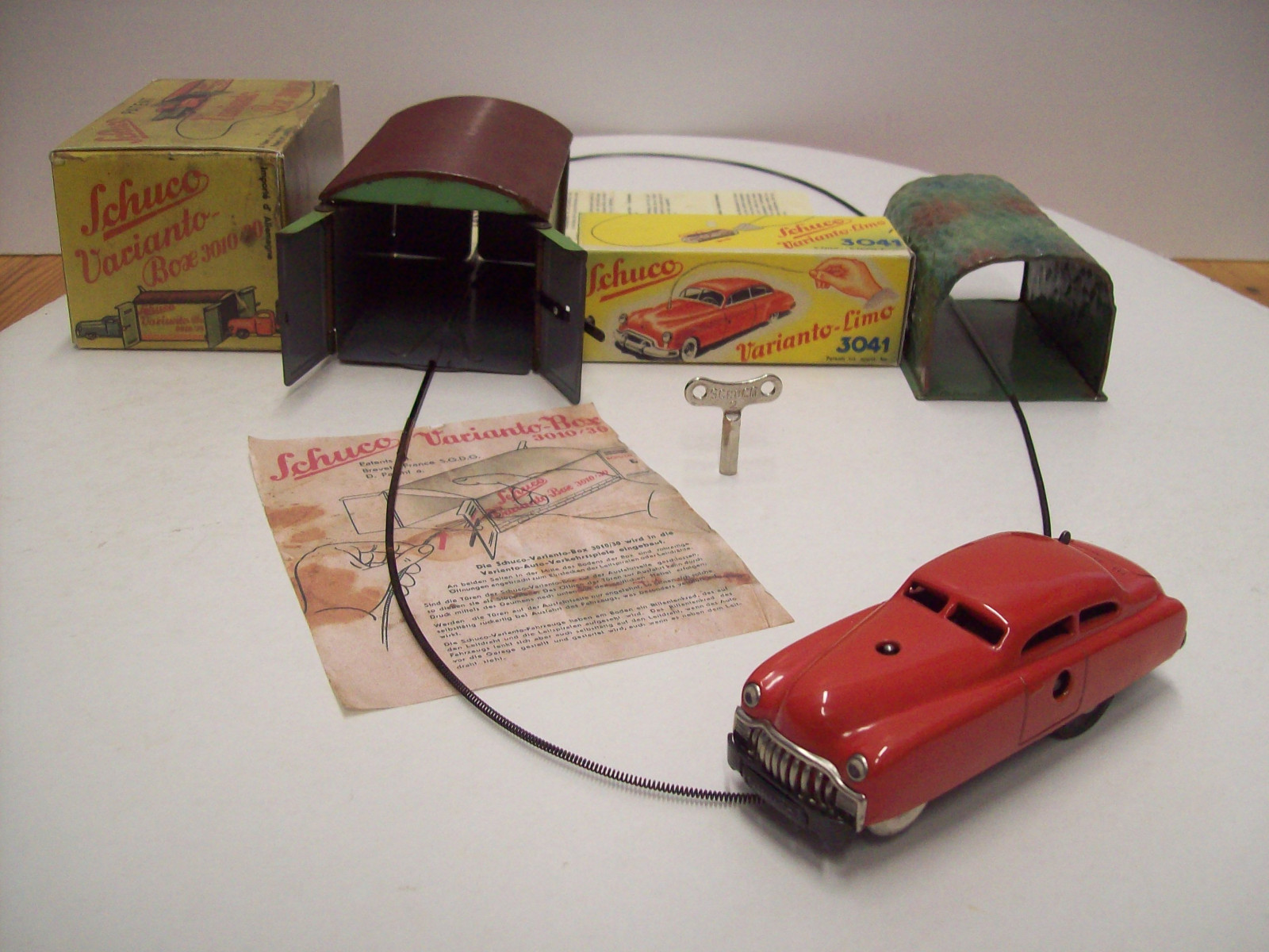 Schuco Varinato-Set, 1951, Bestehend aus Limo 3041, Garage 3010/30, Tunnel 3010/31, Leitdraht L= 100 cm, 2x Leitdraht gerade L= 7,3 cm, Original-Aufziehschlüssel, 2x Repro-Bedienungsanleitung, Schuco (Made in U.S.-Zone Germany), gebraucht, gut erhaltener Zustand in Repro-Boxen