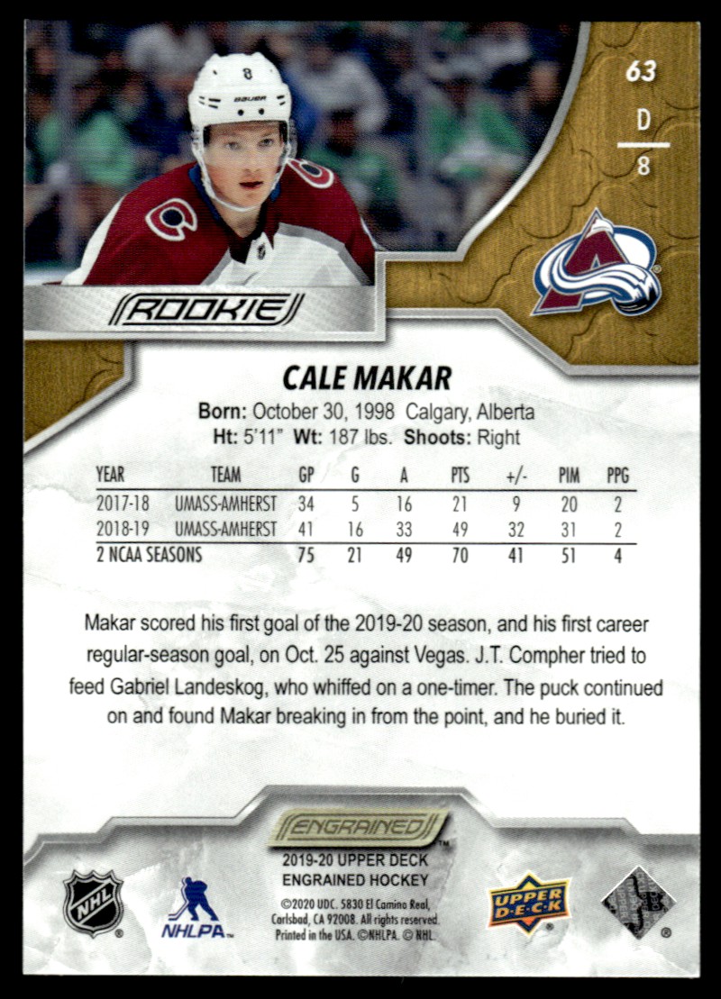 | 2019-20 Upper Deck Engrained Cale Makar RC 291/299 #63 | ||||||||||||||||||