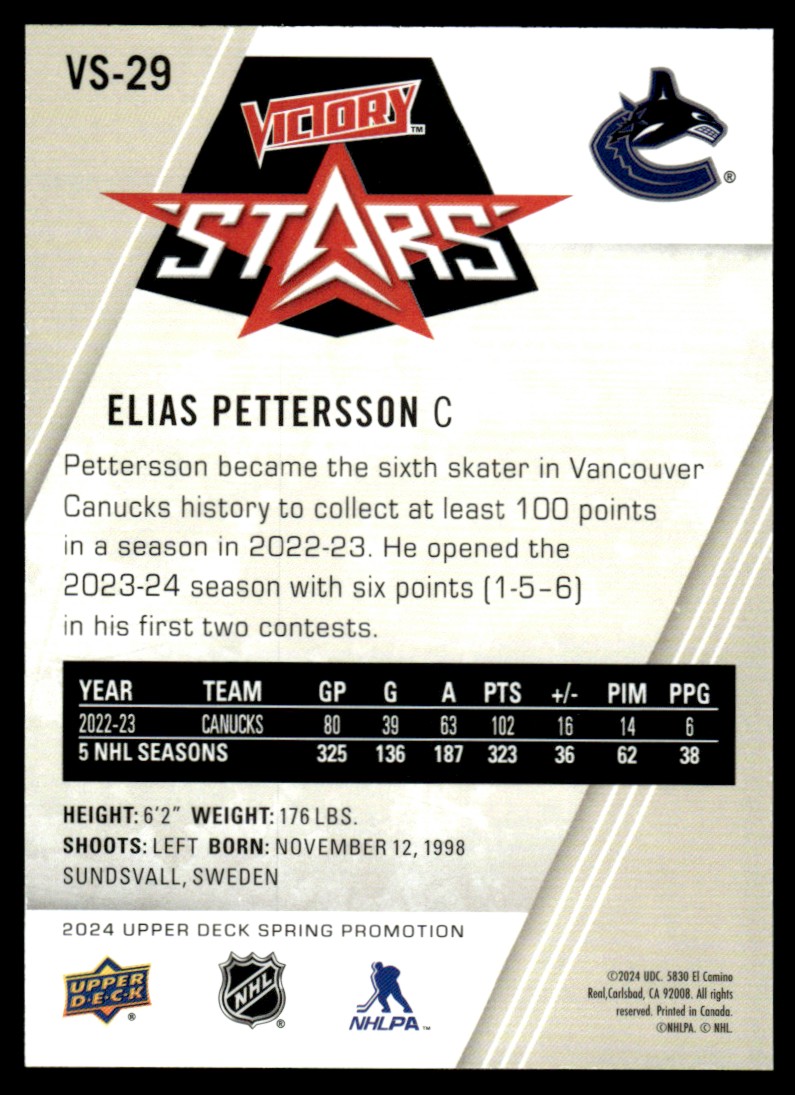 | 2024-25 Upper Deck Spring Expo Victory Stars Elias Pettersson #VS-29 | ||||||||||||||