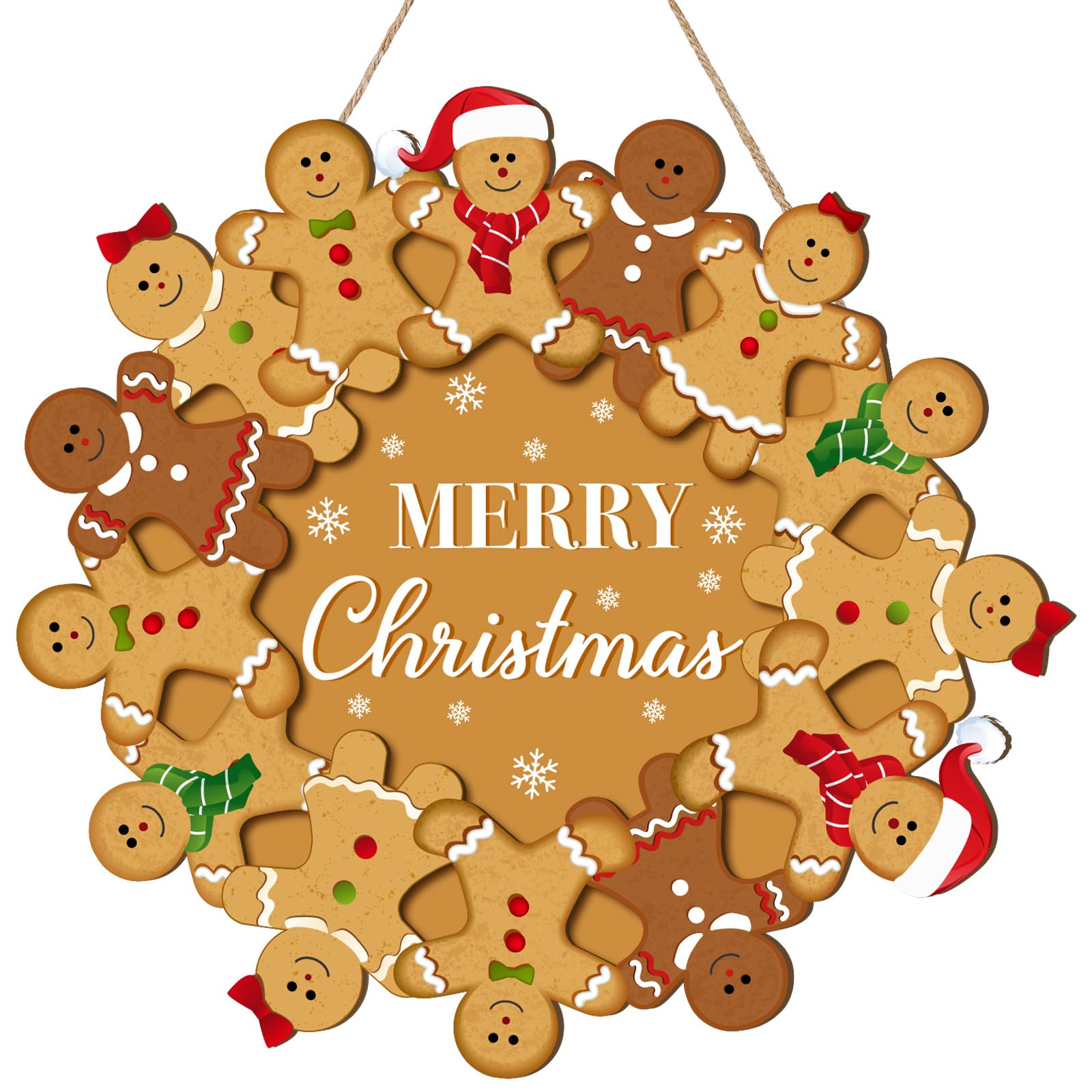 Yousoontic Merry Christmas Gingerbread Man Wreath, Wooden Gingerbread Man Front Door Hanging Sign for Holiday Xmas Indoor Outdoor Home Door/Wall Decor, 11.8 Inch