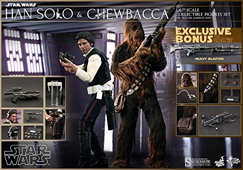 Scale: 1/6 scale Size: Han Solo: about 30 cm height, Chewbacca: a height of about 36 centimeters moveable point: Han Solo: 30 points, Chewbacca: 30 points Accessories (weapons): Han Solo: Blaster pistol, Chewbacca: Bow caster, bonus accessories: blaster rifle, heavy blaster rifle accessories (accessories): Han solo: hair parts (with headset) for replacement, Droid calling device, replacement for hand parts (x 8), Chewbacca: headset, replacement for hand parts (x 2), bonus accessories: storm Trooper of the belt