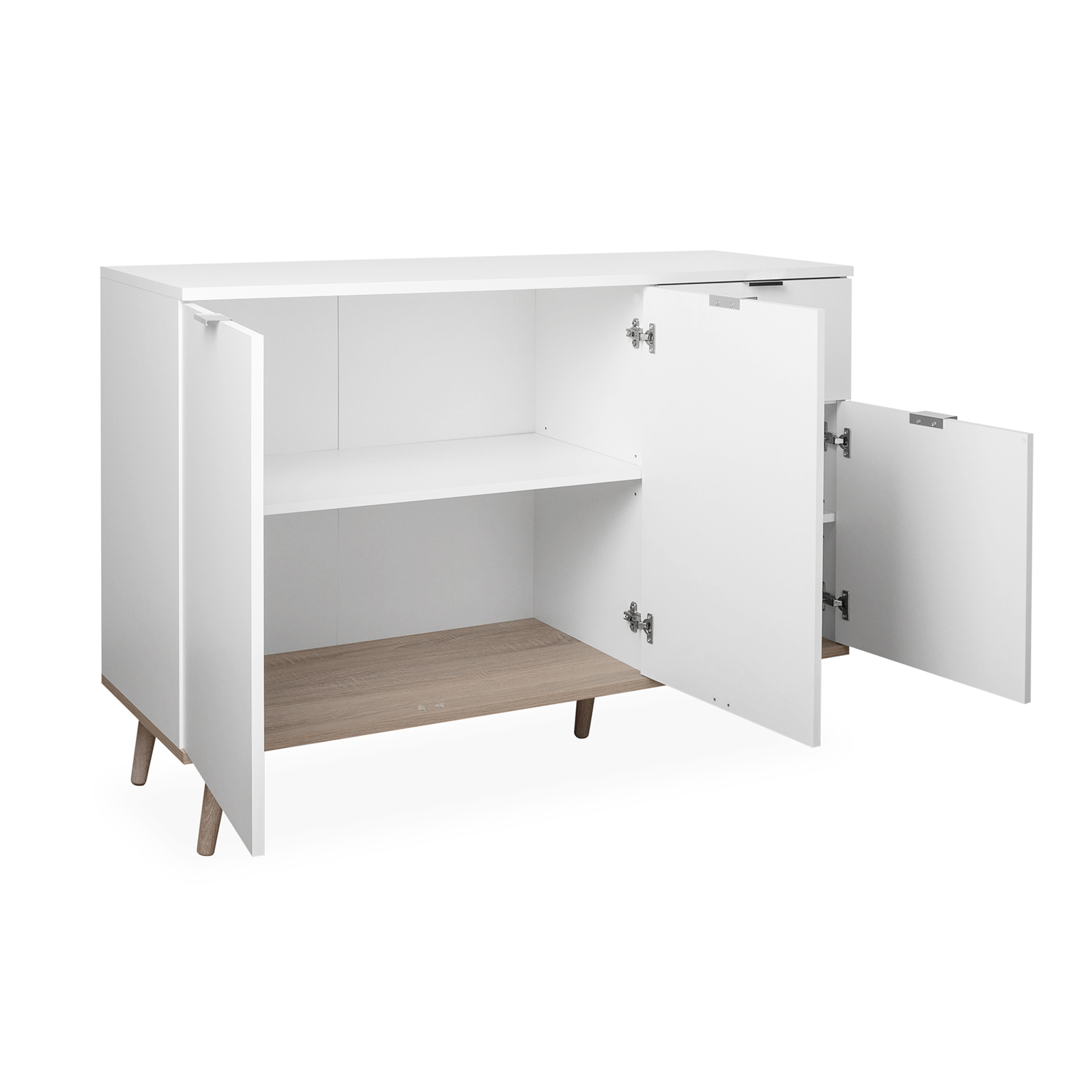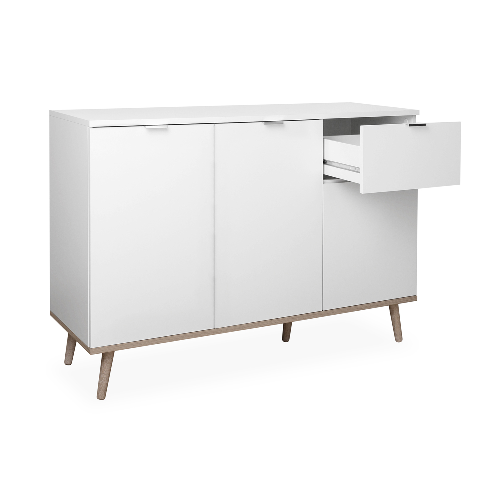 Im skandinavischen Design ist die weiße Kommode mit ihrem Absatz aus Sonoma Eichen Nachbildung ein elegantes Einrichtungsaccessoire nicht nur für das Schlafzimmer, sondern auch zum Beispiel für das Wohnzimmer oder den Eingangsbereich. Unterstrichen wird der Skandi-Look von der matt-weißen Oberfläche zusammen mit den stabilen, konischen Massivholz-Füßen. Die Kombination aus einem Schubkasten sowie den großen Fächern, die sich hinter drei Türen verbergen, bieten Ihnen zahlreiche Möglichkeiten kleinere Dinge, aber auch größere Gegenstände wie zum Beispiel Vasen unterzubringen.