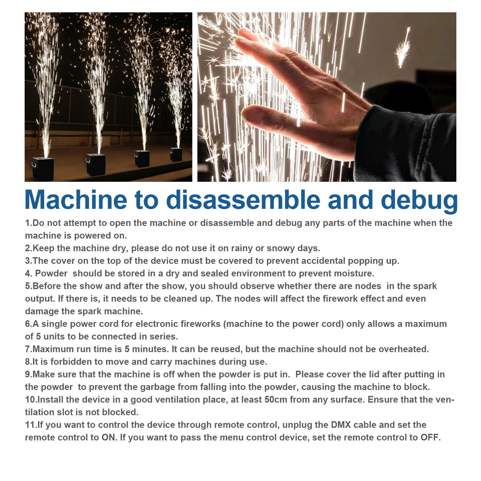 4. Each use of the machine after the machine please clean up the residual material in the special effect machine to prevent clogging the machin