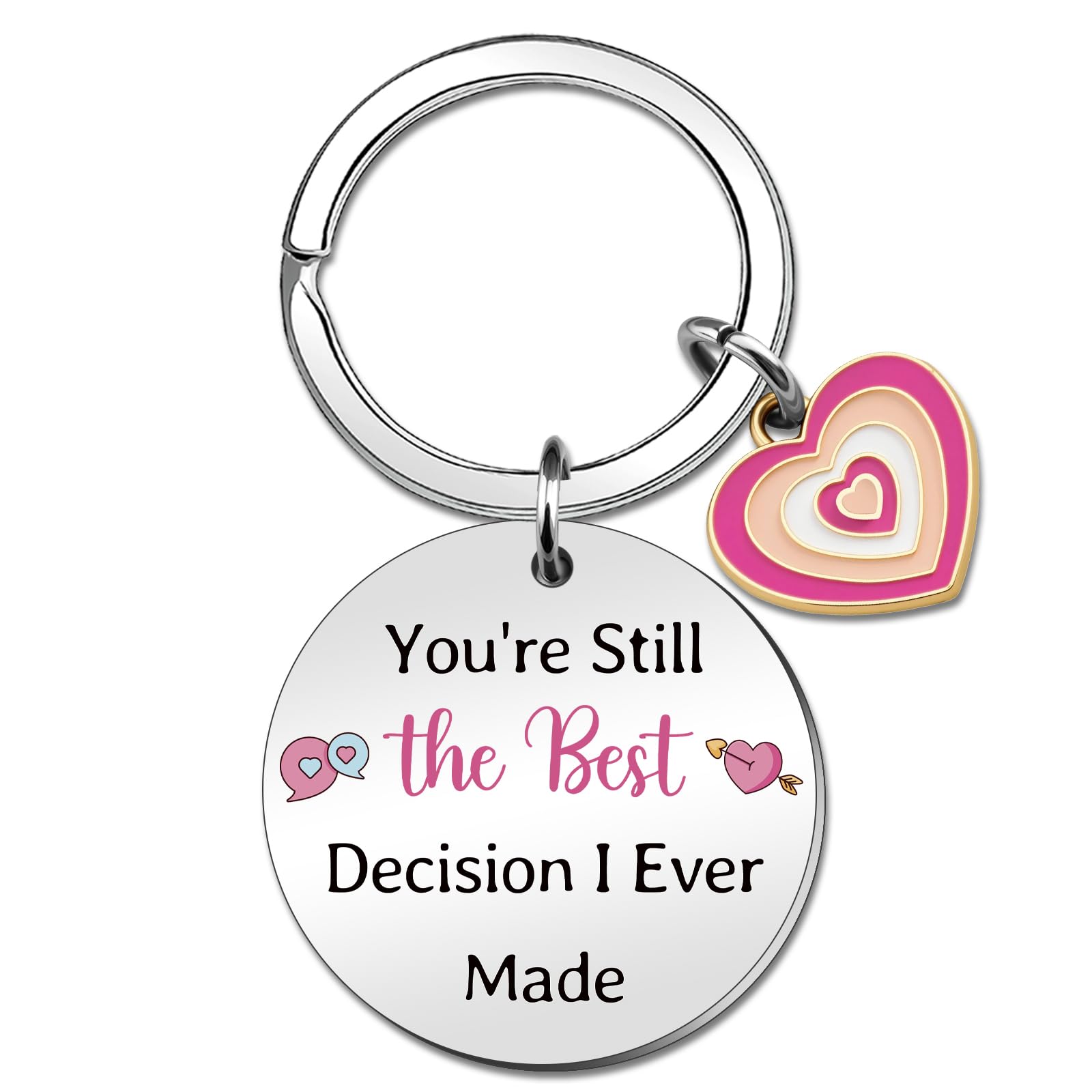 - Valentines Day Gifts For Girlfriend / Valentines Gift Basket: This couple keychain features the heartfelt phrase "You're Still the Best Decision I Ever Made" laser-engraved warm text. A special aniversario gift for her for your beloved can express your feelings , and it also means "I love you". This keychain is symbolizing the wonderful decision of being with her and making the anniversary even more special.
