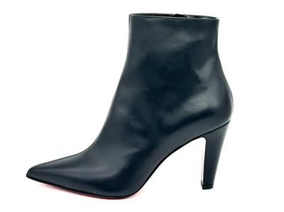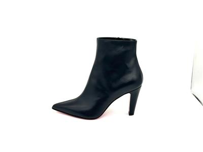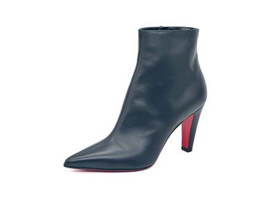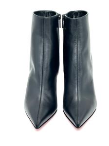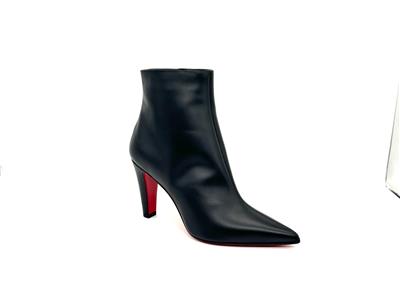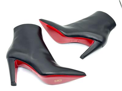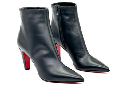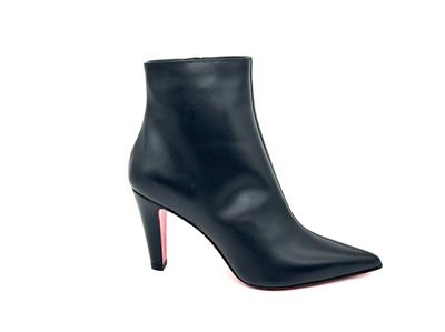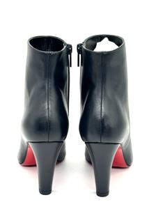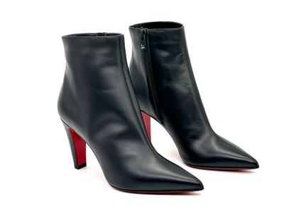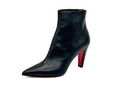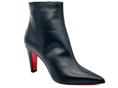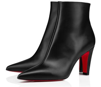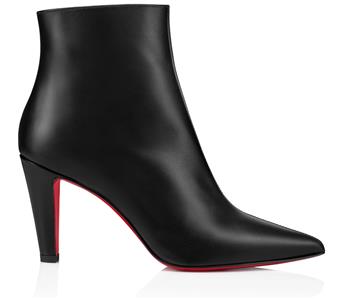 The clean lines and classic silhouette of this calfskin-leather bootie is complete with a house-signature Loubi-red sole.