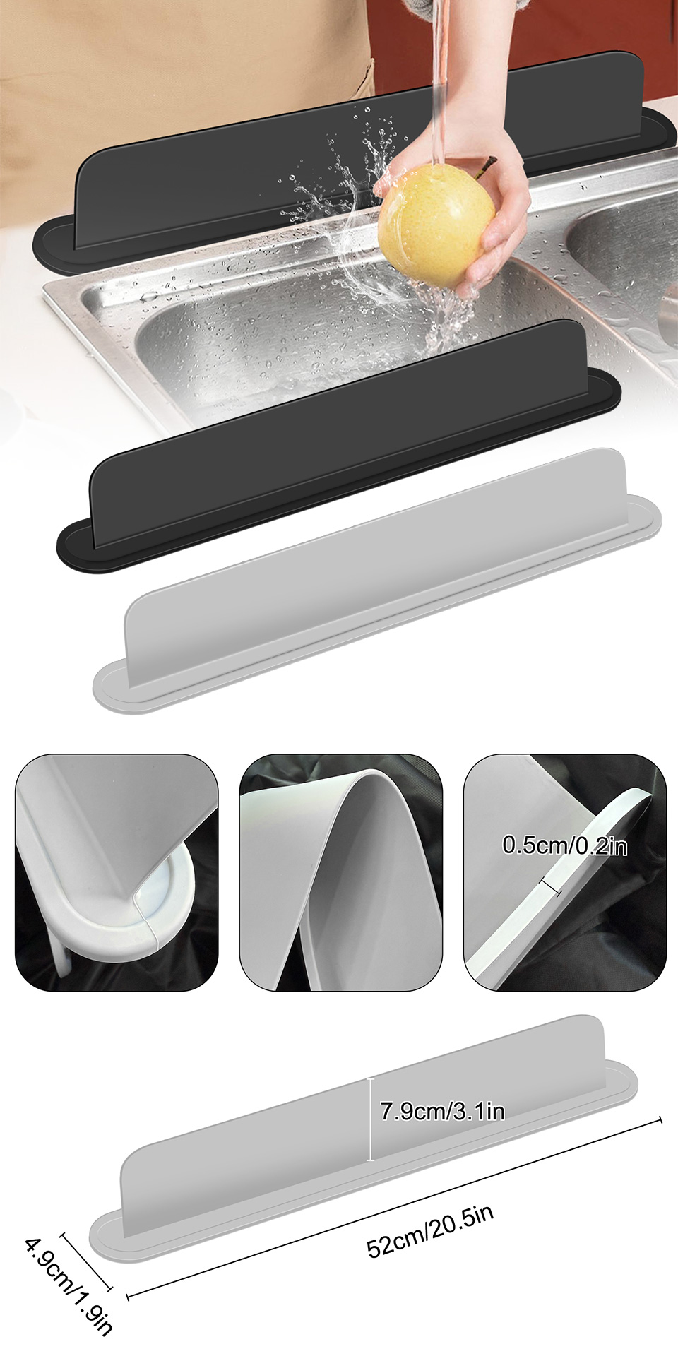 | γ Product Description Silicone Sink Splash Guard with Suction Cups - Contemporary Water Barrier Cover for Kitchen, Dishwasher, Lab & Vegetable Basins - Durable, Easy-Clean Design Reduces Mess & Enhances Safety, Dishwasher Protection, Contemporary Accessory, Flexible Barrier Product Feature π© Durable Material: Made of high-quality silicone, this material is flexible, soft to the touch, heat-resistant, and highly durable. Itβs also machine washable, maintaining its shape and performance even after repeated use β a reliable choice for long-term kitchen convenience. π§ Strong Water Repellency: This kitchen sink splash guard measures 52 x 4.9 x 7.9 cm / 20.5 x 1.9 x 3.1 in (L x W x H), offering a suitable barrier without affecting regular sink use. For longer sinks, multiple silicone sink splash guards can be placed together to extend the coverage. π§½ Easy to Clean: Made from durable, soft, and odor-free silicone, this sink splash guard resists stains and buildup. It can be wiped down with a damp cloth, rinsed with warm or soapy water, or cleaned in the dishwasher. π§² Strong Suction: This sink water splash guard adheres well to smooth surfaces like marble, granite, and laminate. Just clean and dry the area and press the guard down β no tools or adhesives required. It stays put without slipping around. πΏ Keeps Surfaces Dry: Designed to block water splashes, this splash guard for the kitchen sink area helps prevent water from reaching your countertop, floor, and clothing β keeping the surrounding area neater and drier. π‘ Versatile Use: Useful in kitchens, bathrooms, laundry rooms, RVs, and so on. Whether placed at the front, back, or sides of the sink, this silicone sink baffle splash guard offers a simple way to protect wherever water tends to splash.