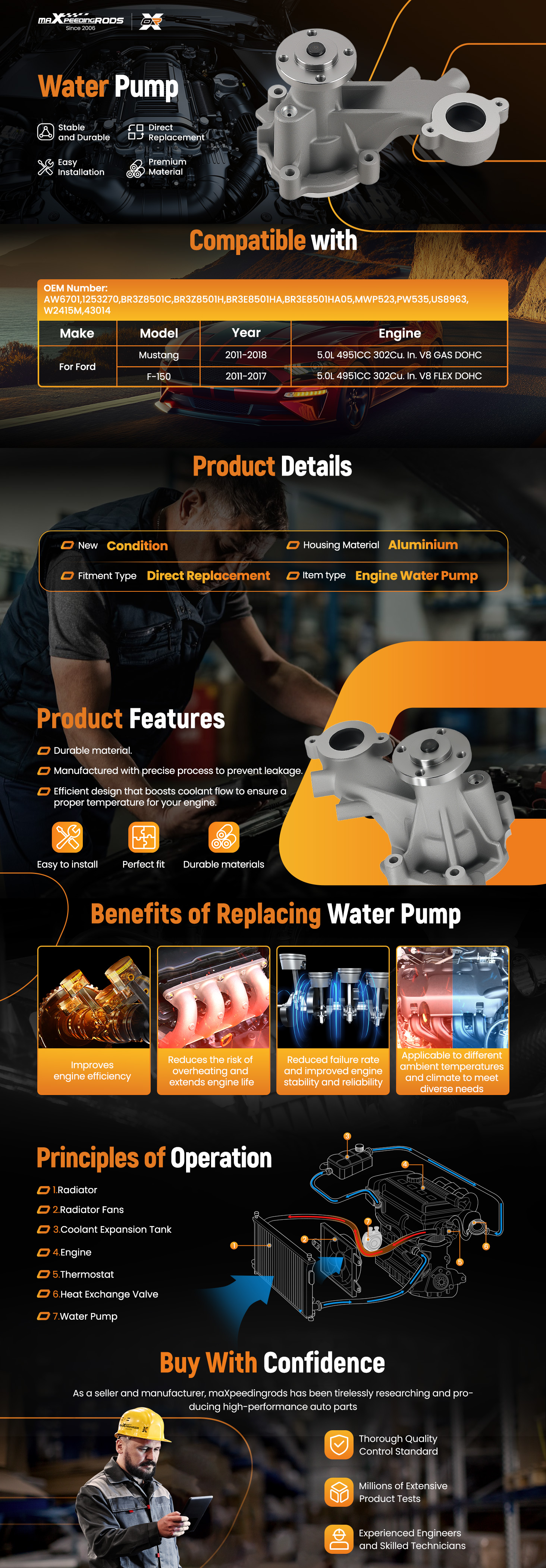 V8 Water Pump Assembly for Ford F-150 Mustang 2011-2017 BR3Z8501C Aluminum