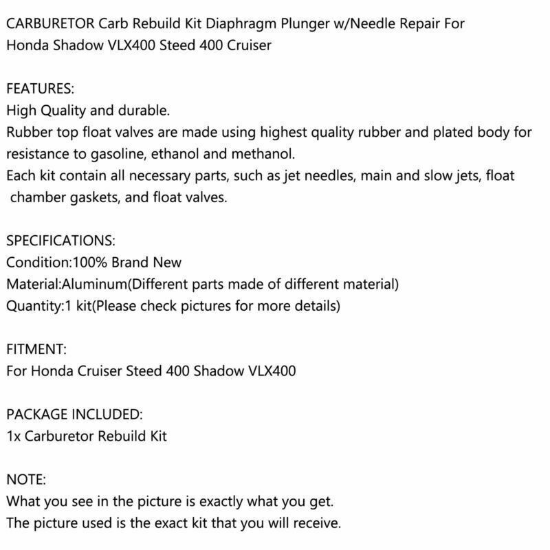 CARBURETOR Carb Rebuild Kit Diaphragm Plunger w/Needle Repair For Honda Shadow VLX400 Steed 400 Cruiser FEATURES: SPECIFICATIONS: FITMENT: PACKAGE INCLUDED: NOTE: