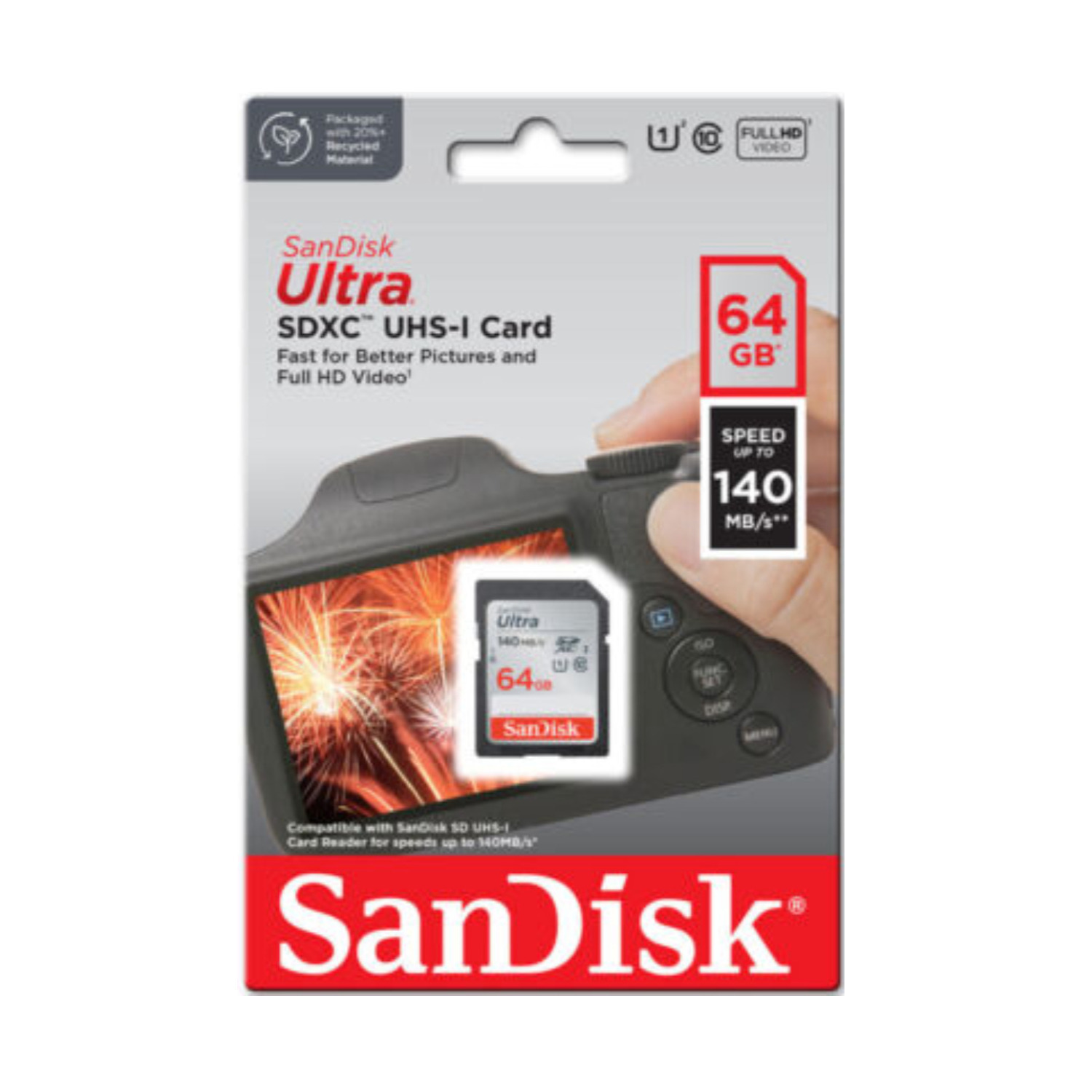 Take better pictures and Full HD videos with your compact to mid-range point-and-shoot cameras. With this SanDisk Ultra SD card, you’ll benefit from faster downloads, large volume capacity, and better performance to capture and store up to 64GB of high-quality pictures and Full HD video.SanDisk Ultra UHS-I SD cards are water-proof, temperature-proof, X-ray proof, shockproof, and compatible with SDHC and SDXC digital devices.