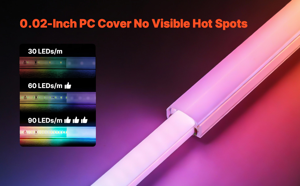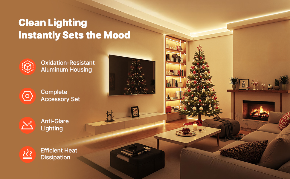 The LED strip diffuser channel uses a 0.02-inch thick PC cover that spreads light evenly, reduces harsh hot spots, and is gentle on the eyes. It creates a smooth, soft, and comfortable lighting atmosphere.