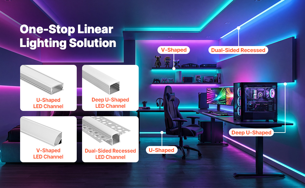 Multiple Options Available: One-stop linear lighting solution with various LED channel styles: U-shaped for hidden lighting, plus-size U-shaped for soft glare-free glow, V-shaped for focused accents, and double-sided recessed for clean, seamless designs