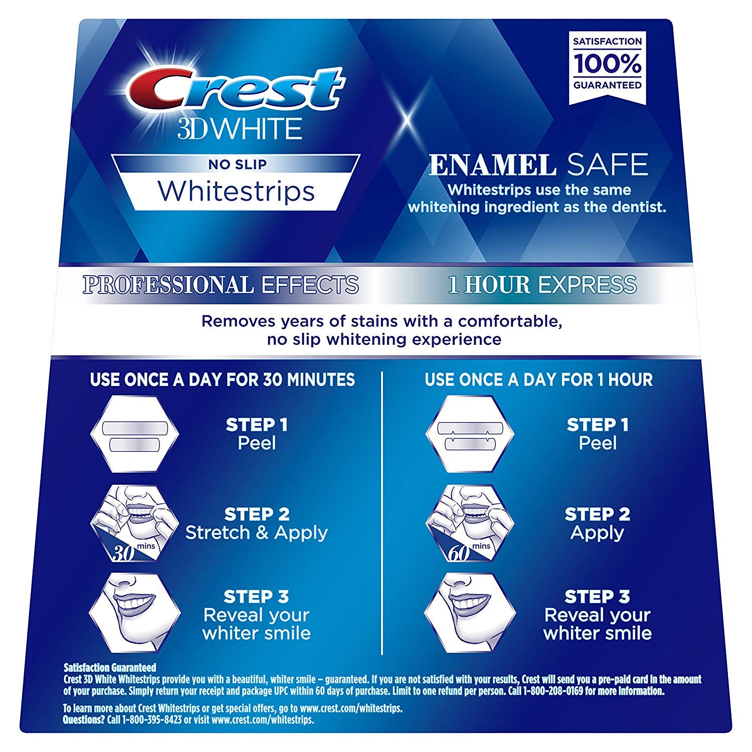 Achieve professional-level teeth whitening results and remove 14 years of stains in just 30 minutes a day with Crest 3D White Whitestrips Professional Effects. You’ll see a whiter smile after 3 days, and full results in 20 days. As a bonus, this kit contains two treatments of 1 Hour Express that quickly reveal same-day results for a noticeably whiter smile.