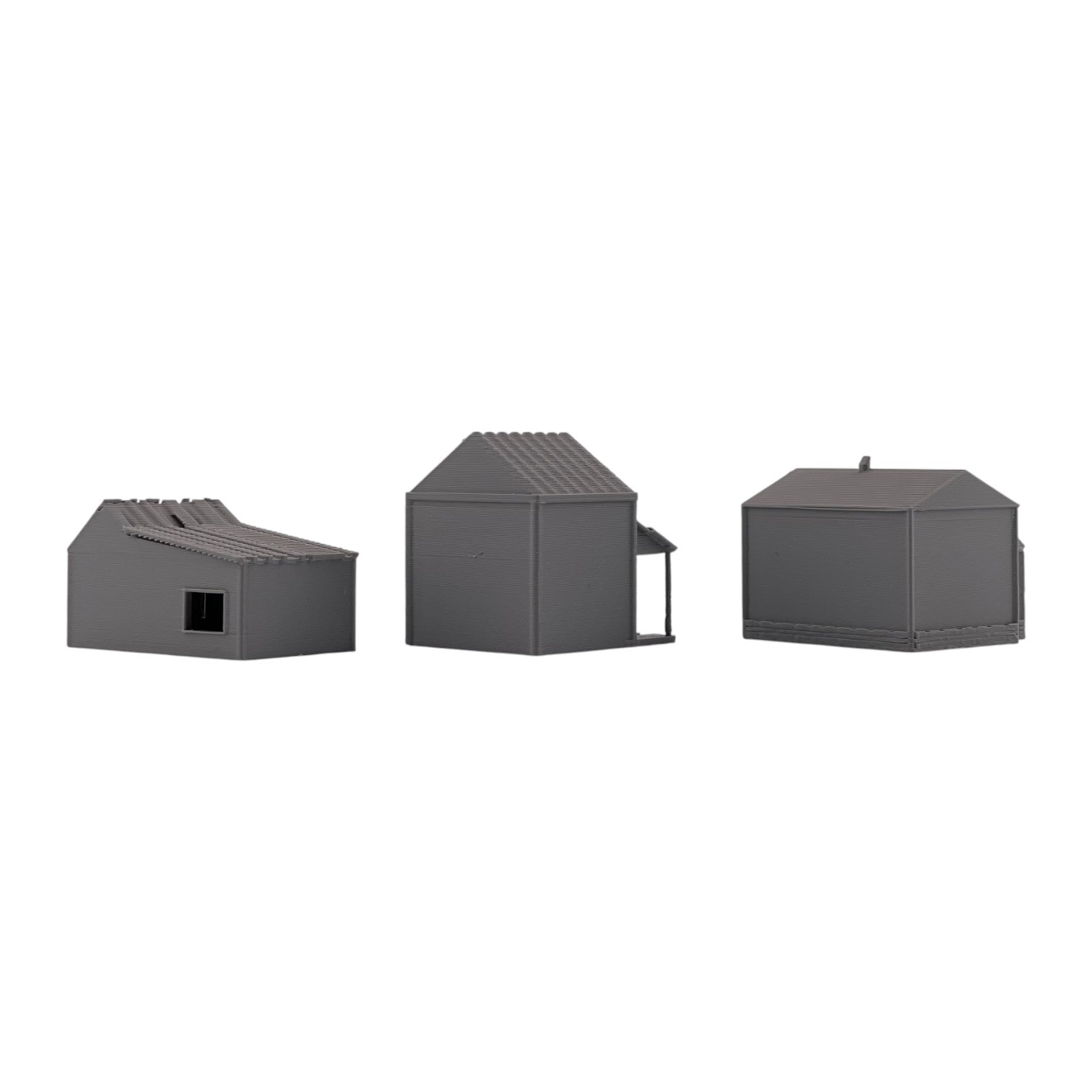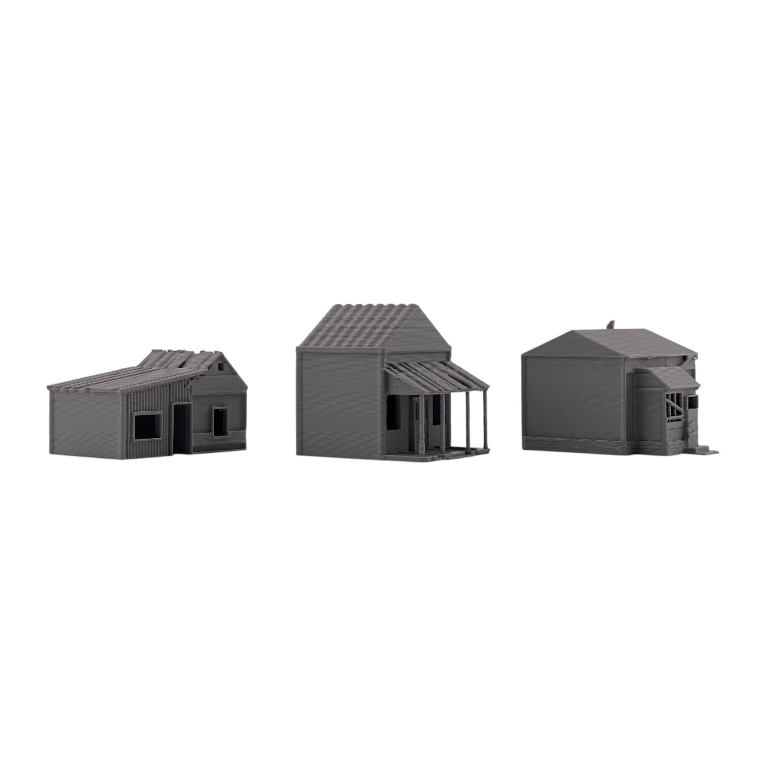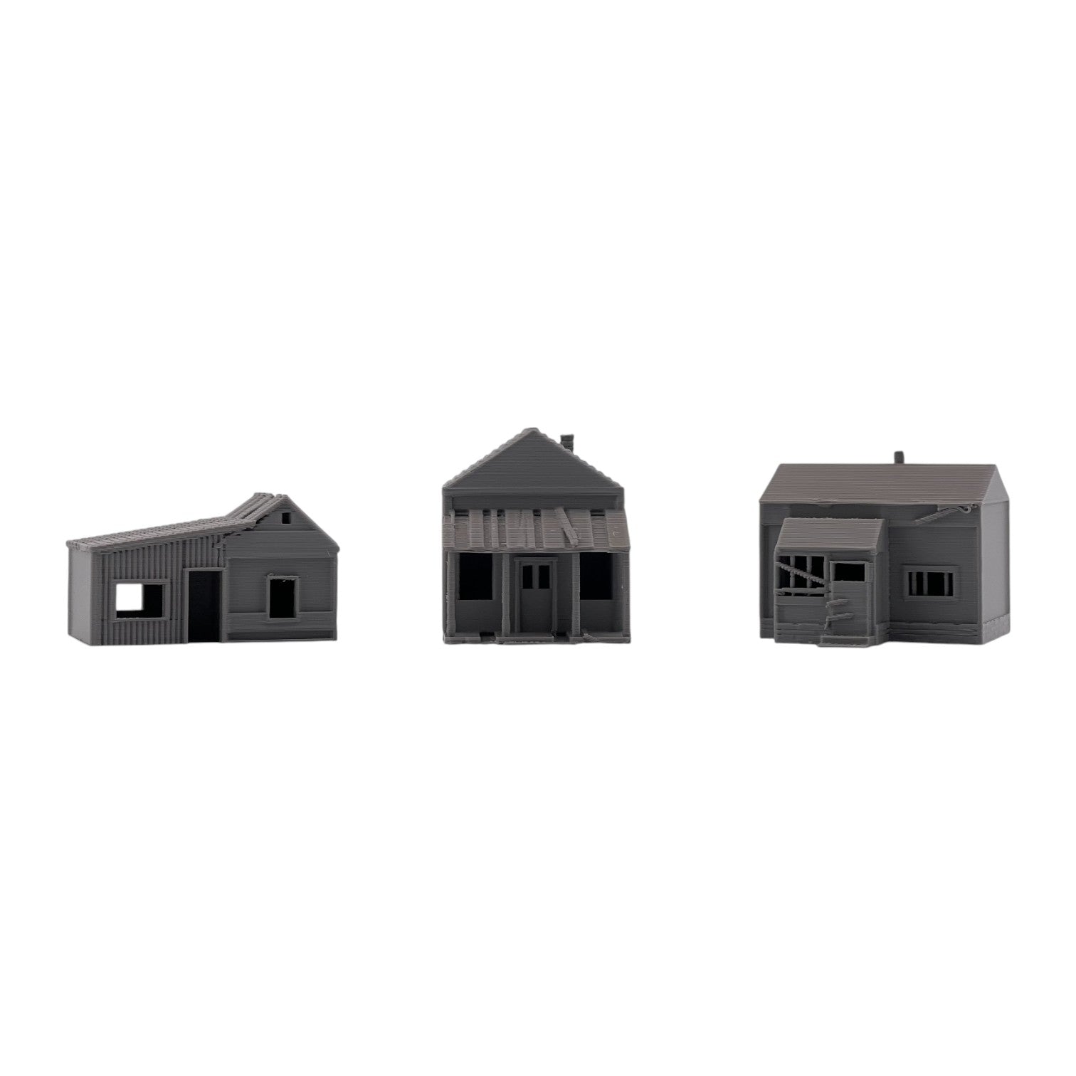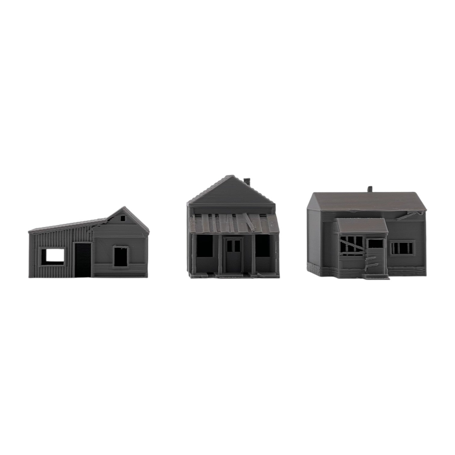Add atmosphere and storytelling to your layout with this set of three Small Abandoned Houses. Designed to capture the look of run-down, long-forgotten structures, these buildings are perfect for depicting neglected neighborhoods, rural backroads, or areas left behind by time. They can also be used as weathered trackside shanties-ideal for representing forgotten worker housing, maintenance sheds, or long-abandoned structures along quiet rail lines.