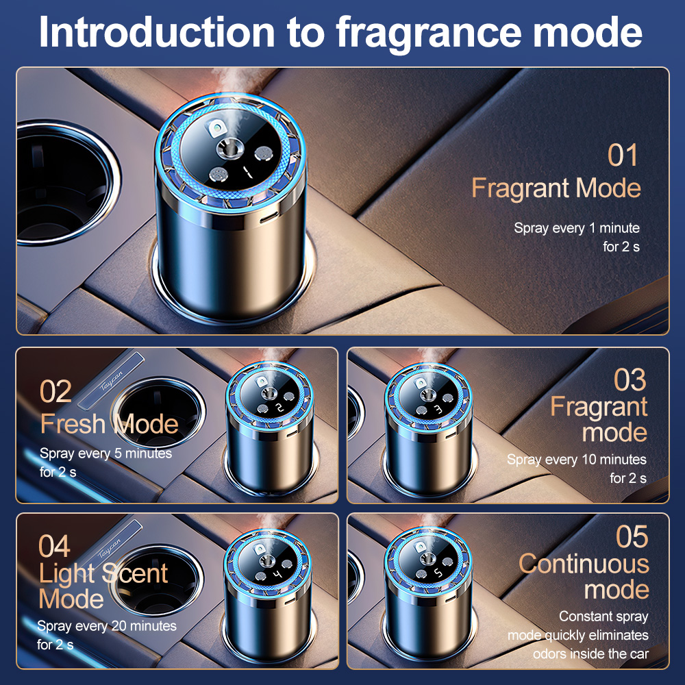 -With intelligent start-stop function, after the vehicle starts, the machine automatically starts to spray fragrance. After the vehicle stops, the machine automatically goes into standby mode and stops spraying fragrance.