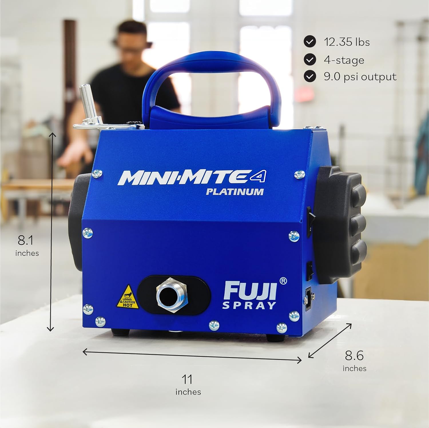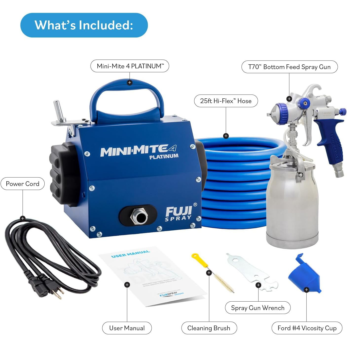 Advanced Spray Gun: Includes the Fuji T-70 non-bleed spray gun with a 1-quart cup and a side pattern control knob for adjusting fan size.