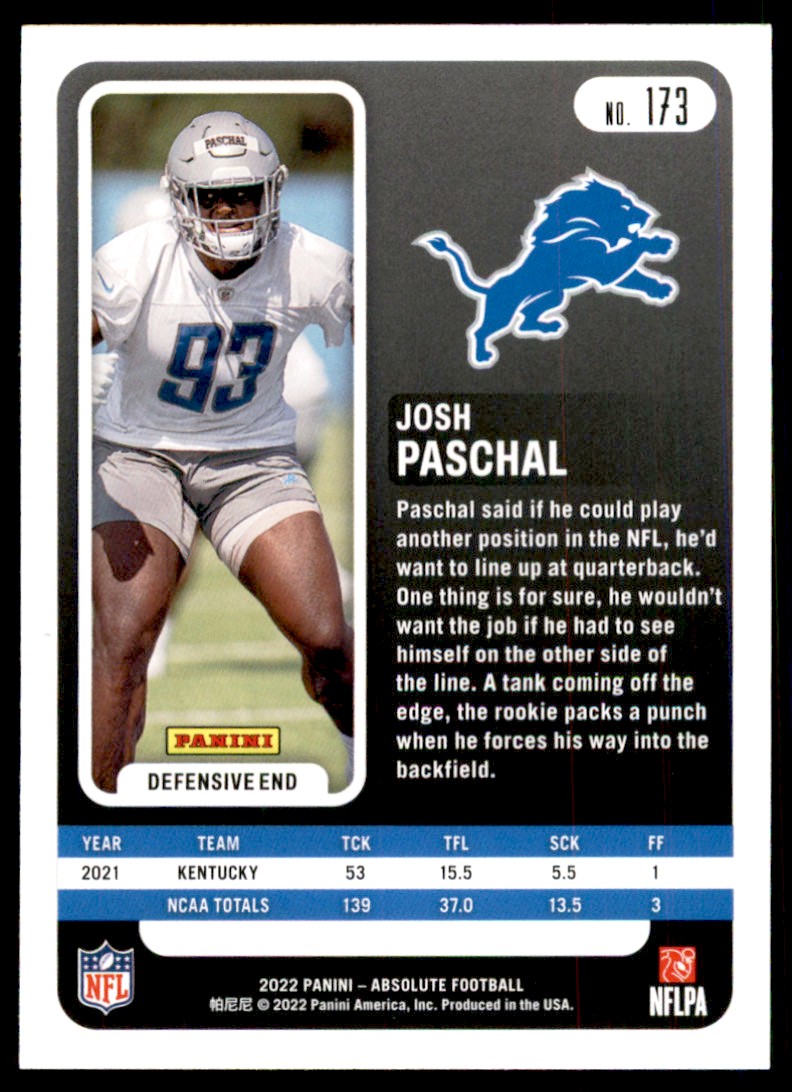 | Description: | Josh Allen | | Category: | Football | | Year: | 2022 | | Product: | Panini Absolute | | Team: | Detroit Lions. | | Card Number: | 173 | | Rookie: | Yes | | Dimensions: | 3½" x 2½" |